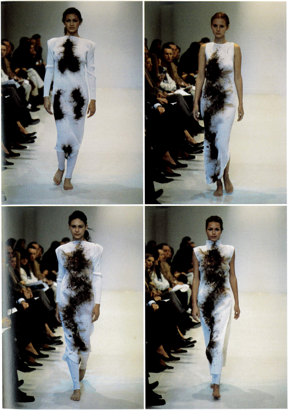 其中与中国艺术家蔡国强的合作是这个系列的收官之作,在当年卡地亚艺术基金会举行的艺术展上,三宅一生在将50件纯白衣服以 “龙”的形状铺在地上,放上烟火后点燃,火光乍现一瞬间,作品便完成了。