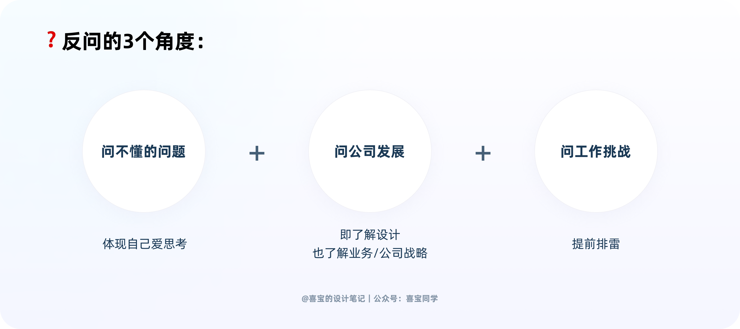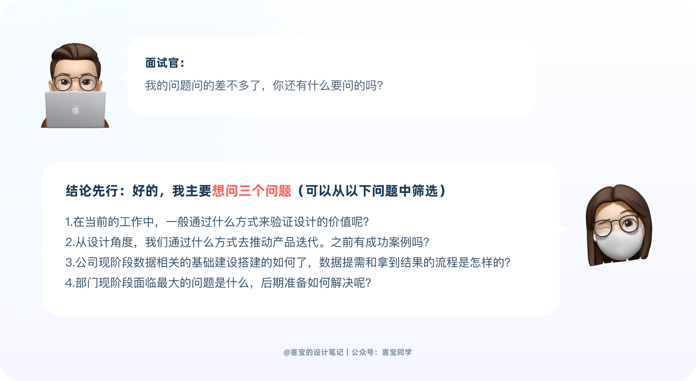 一定要问!这个事儿我说了很多次,不要害怕问问题。我们可以通过这个问题获取很多信息!!问之前面试过程中不懂的问题,体现自己爱思考。问公司发展,体现你不光关注设计,同时我们也关心业务关心公司战略。问工作挑战,提前排雷,能否接受岗位现阶段存在的问题。