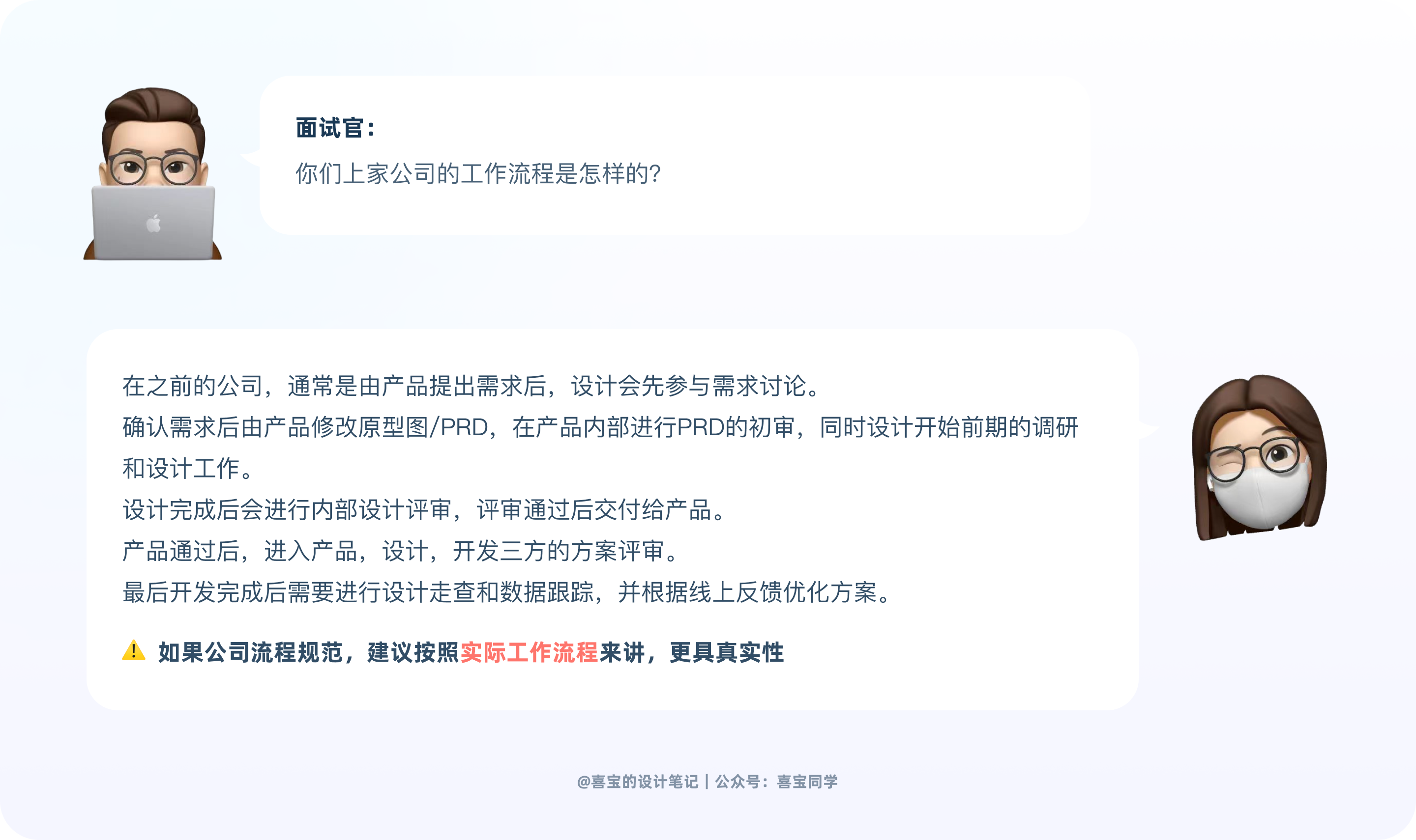 一般情况下,可以根据公司的实际情况来说,讲清楚流程和分工即可。如果公司流程极其不规范,建议按照常规公司的标准流程来回答。如果你说出来的过于不规范,面试官可能认为你不够专业或者不懂常规的工作流程。因此判定你为培训学校出身/在校学生没有实际的工作经验,入职后可能出现合作和沟通方面的问题,甚至因此怀疑作品的真实性。