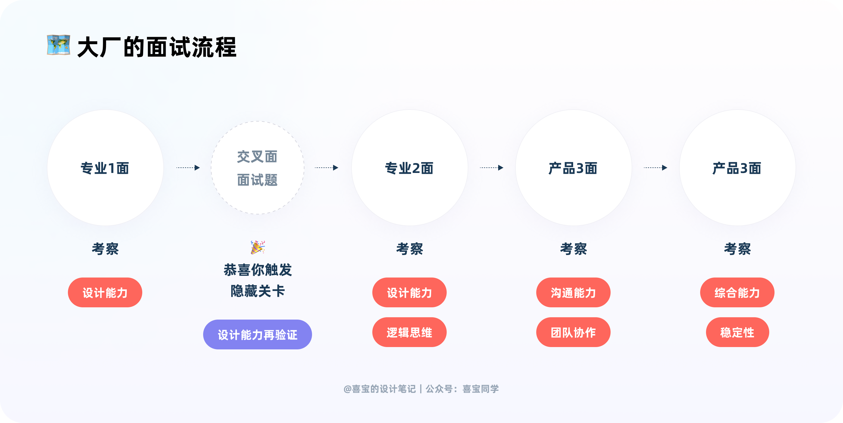 在聊面试问题前,我们来一起看看大厂的面试流程有哪几步。一般大厂面试多为4面,分别是专业1面,专业2面,产品3面和HR4面。如果面试发挥不好,甚至可能加面,交叉面(即其他业务的同职级的设计主管对你进行面试)和发笔试题。这些加面一般出现在2面前后,本质是因为面试官无法对你的专业能力完全信任,所以需要其他面试官/你的笔试题作为参考。下面带大家分析一下常规每轮面试,面试官的考察重点有何不同。