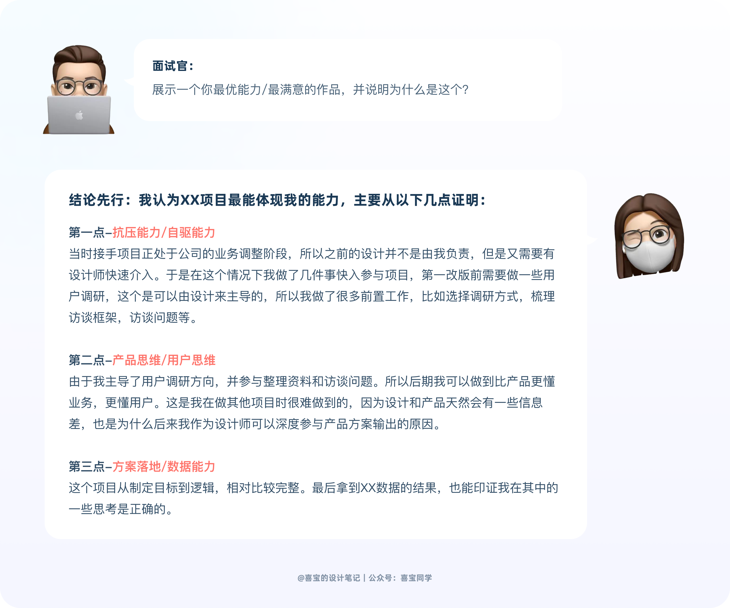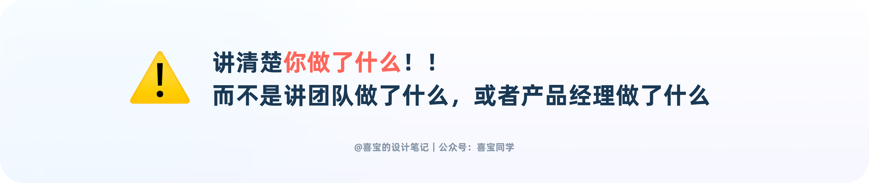 结合面试岗位的JD,需要在作品介绍过程中讲清楚自己的与之匹配的能力。讲清楚你遇到的问题是什么,你是怎么思考并解决的,通过这些体现了你什么能力。🖍划重点,讲清楚你做了什么,不要讲团队做了什么,或者产品经理做了什么。