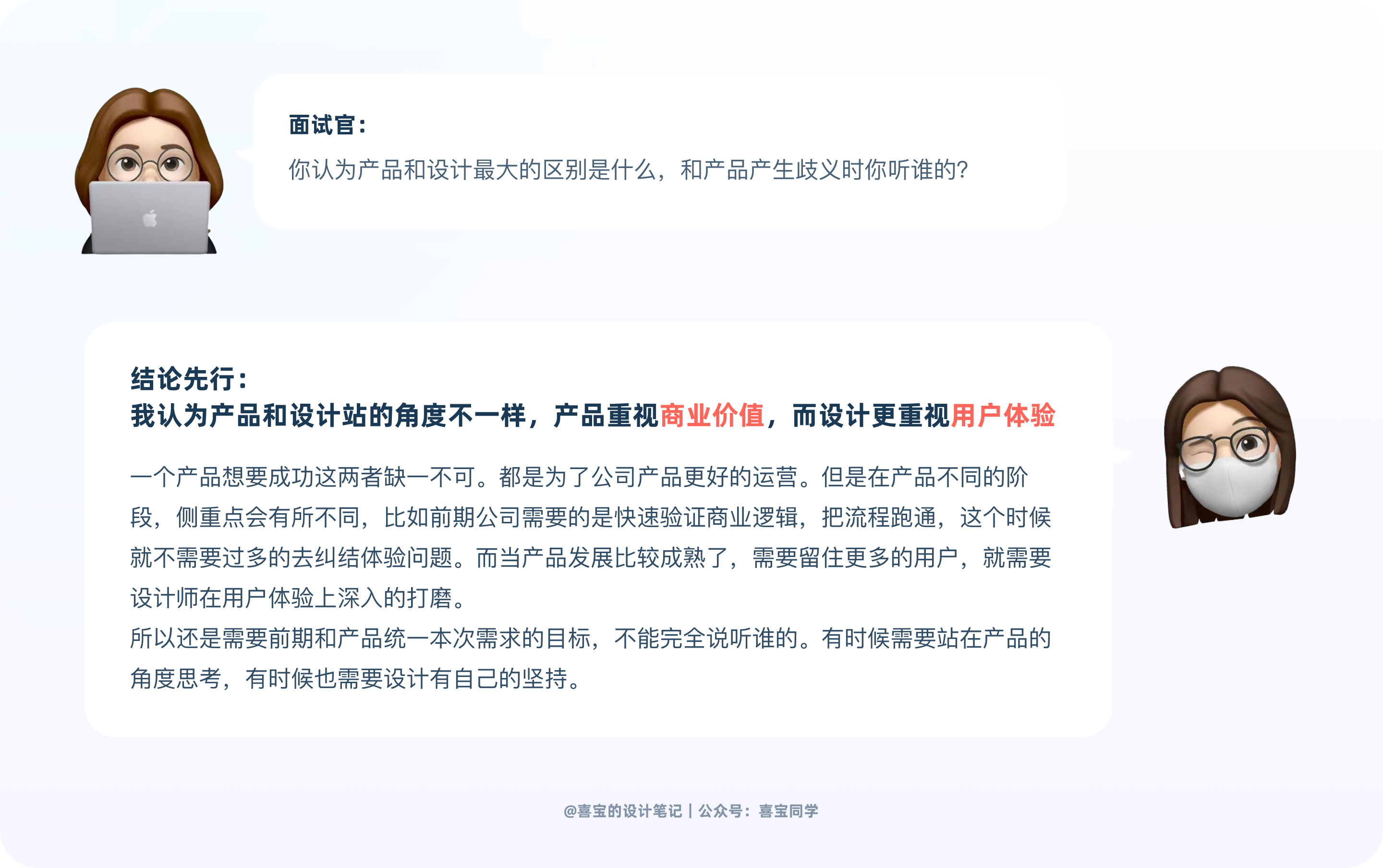先描述产品和设计的分工,为什么产生歧义,再说我们如何避免/处理争端(由于已经在产品面了,这时候就要体现你如何为产品着想,体现你的善解人意~)