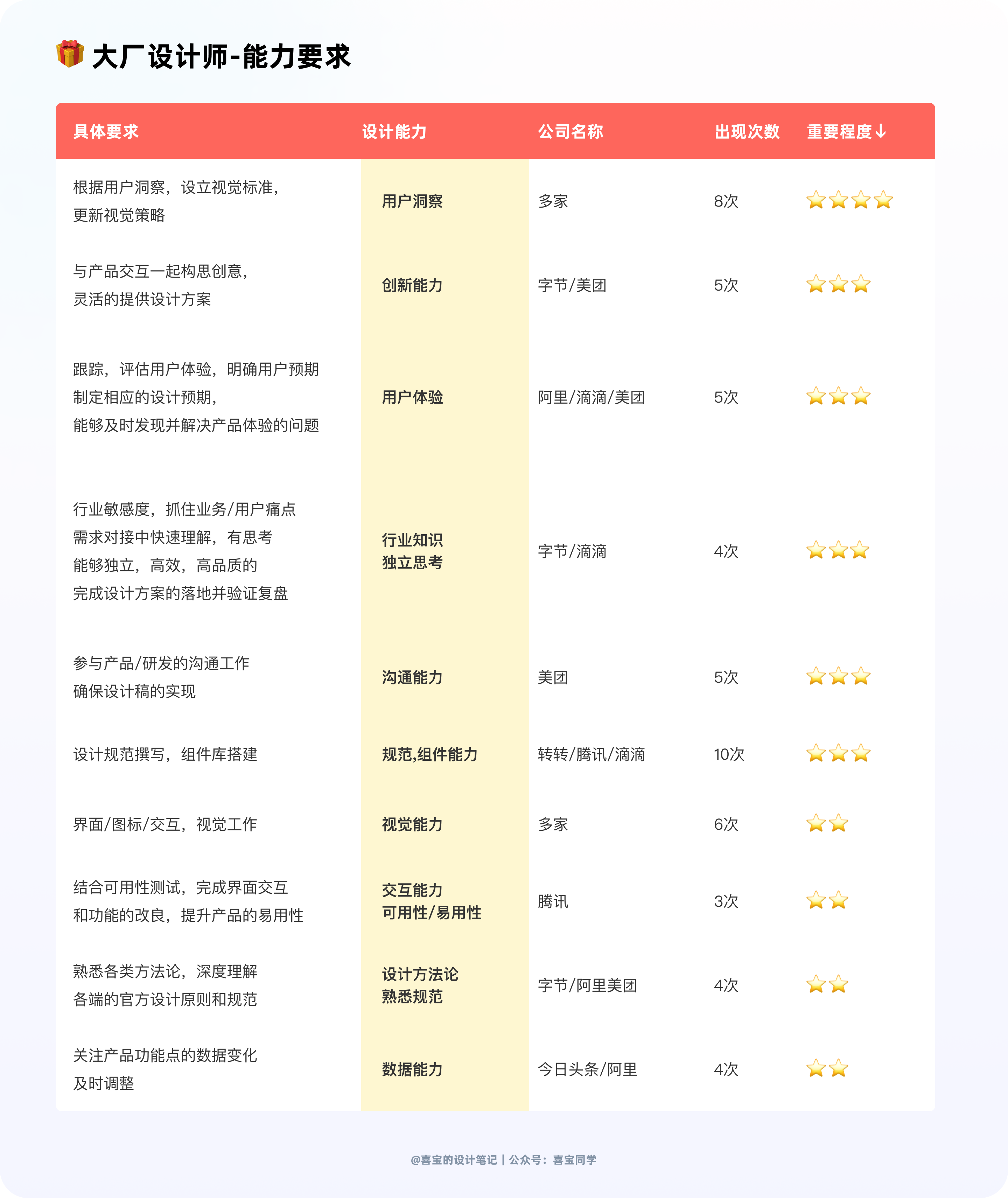 有些同学可能不知道UI/UX 设计师需要具备什么能力。这里我为大家总结了2022年,各互联网大厂的对UI/UX设计师招聘JD,并总结了其中高频出现的设计能力要求(按这个准备就好啦!)。