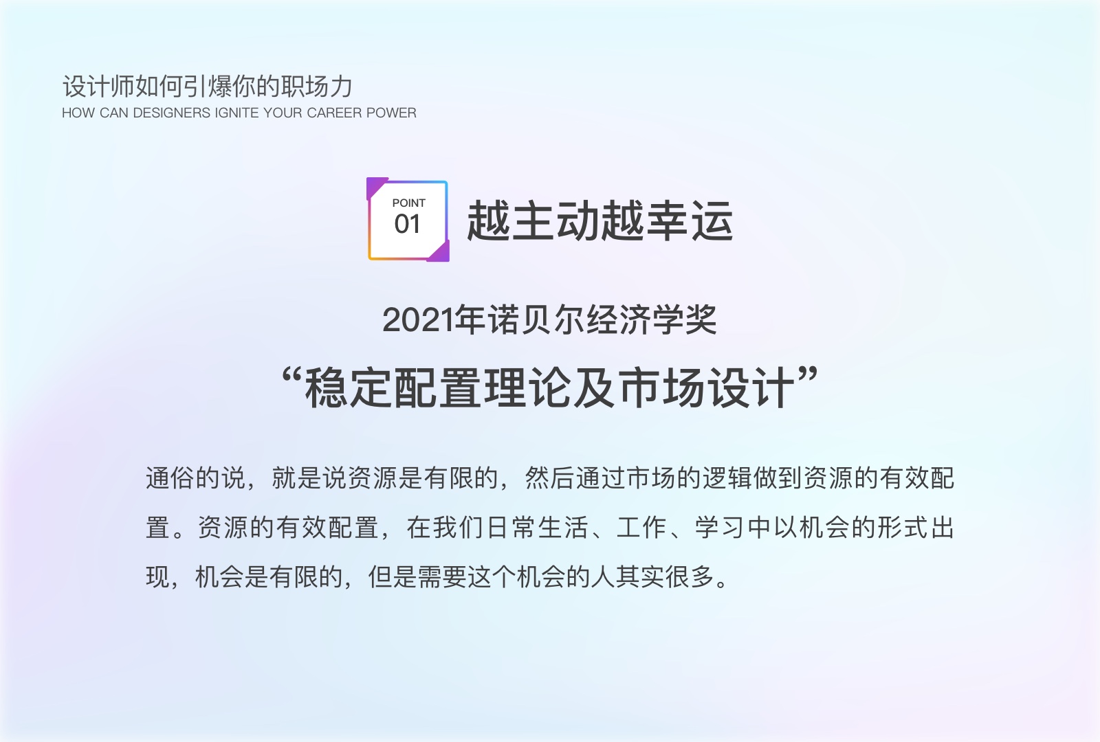 关于越主动越幸运,这背后是有一个科学的道理的。2012年诺贝尔经济学奖获得者,当时研究的课题在经济学中叫“稳定配置理论及市场设计”。通俗的说,就是说资源是有限的,然后通过市场的逻辑做到资源的有效配置。资源的有效配置,在我们日常生活、工作、学习中以机会的形式出现,机会是有限的,但是需要这个机会的人其实很多。