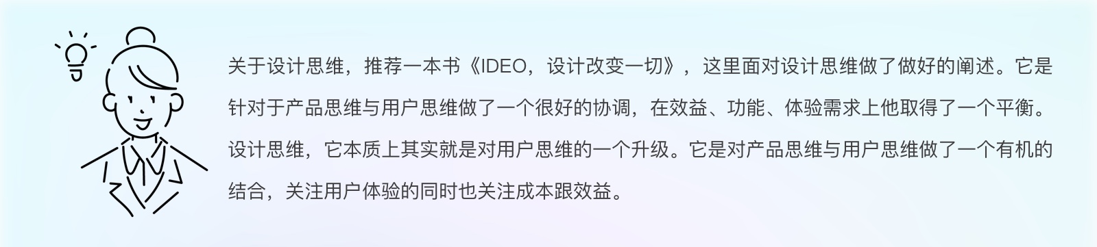 设计思维,它本质上其实就是对用户思维的一个升级。它是对产品思维与用户思维做了一个有机的结合,关注用户体验的同时也关注成本跟效益。