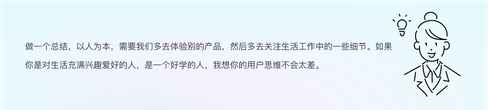 做一个总结,以人为本,需要我们多去体验别的产品,然后多去关注生活工作中的一些细节。如果你是对生活充满兴趣爱好的人,是一个好学的人,我想你的用户思维不会太差。