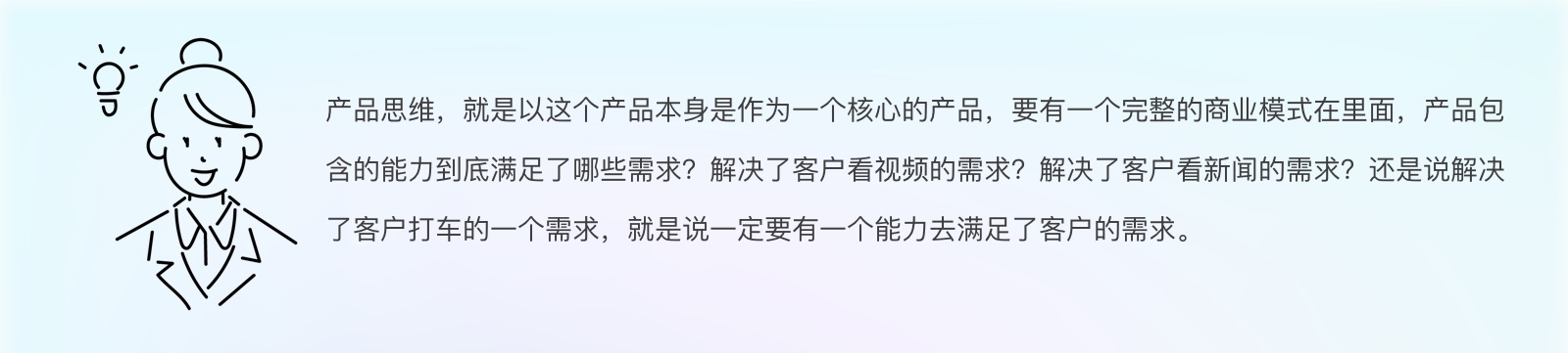所以说产品思维,就是以这个产品本身是作为一个核心的产品,要有一个完整的商业模式在里面,产品包含的能力到底满足了哪些需求?解决了客户看视频的需求?解决了客户看新闻的需求?还是说解决了客户打车的一个需求,就是说一定要有一个能力去满足了客户的需求。