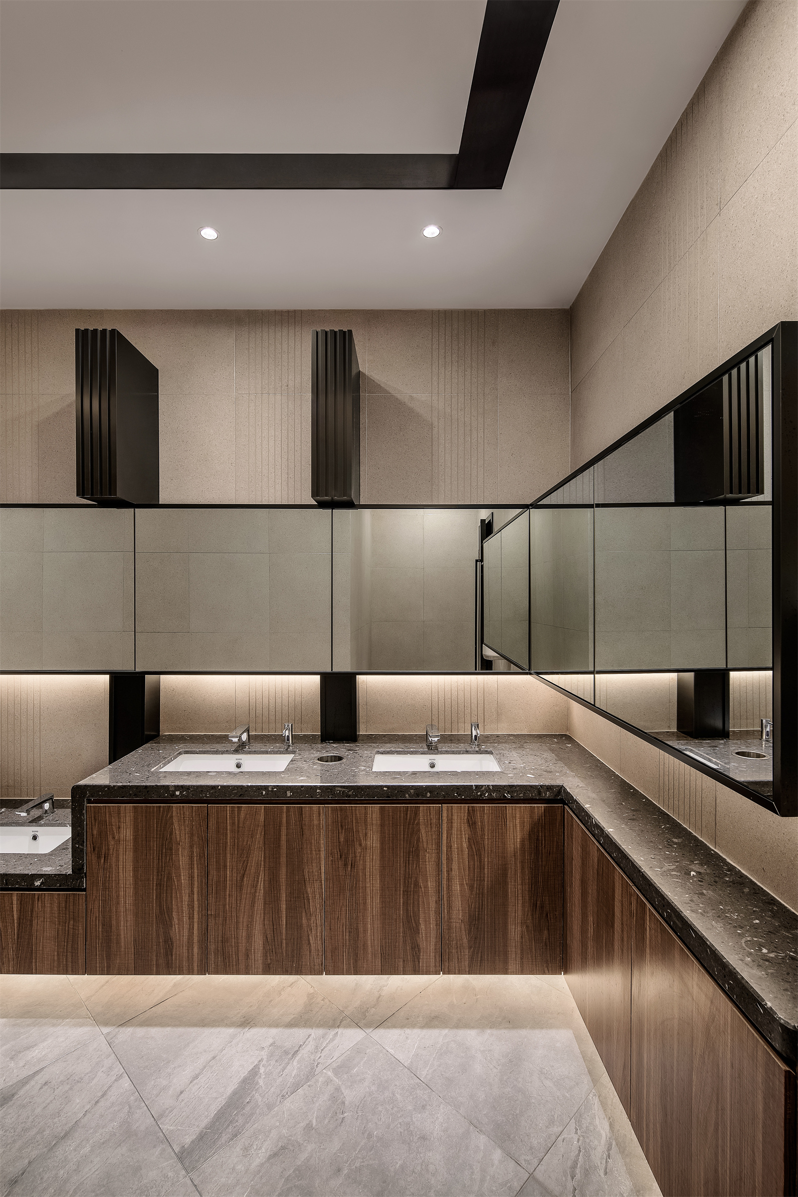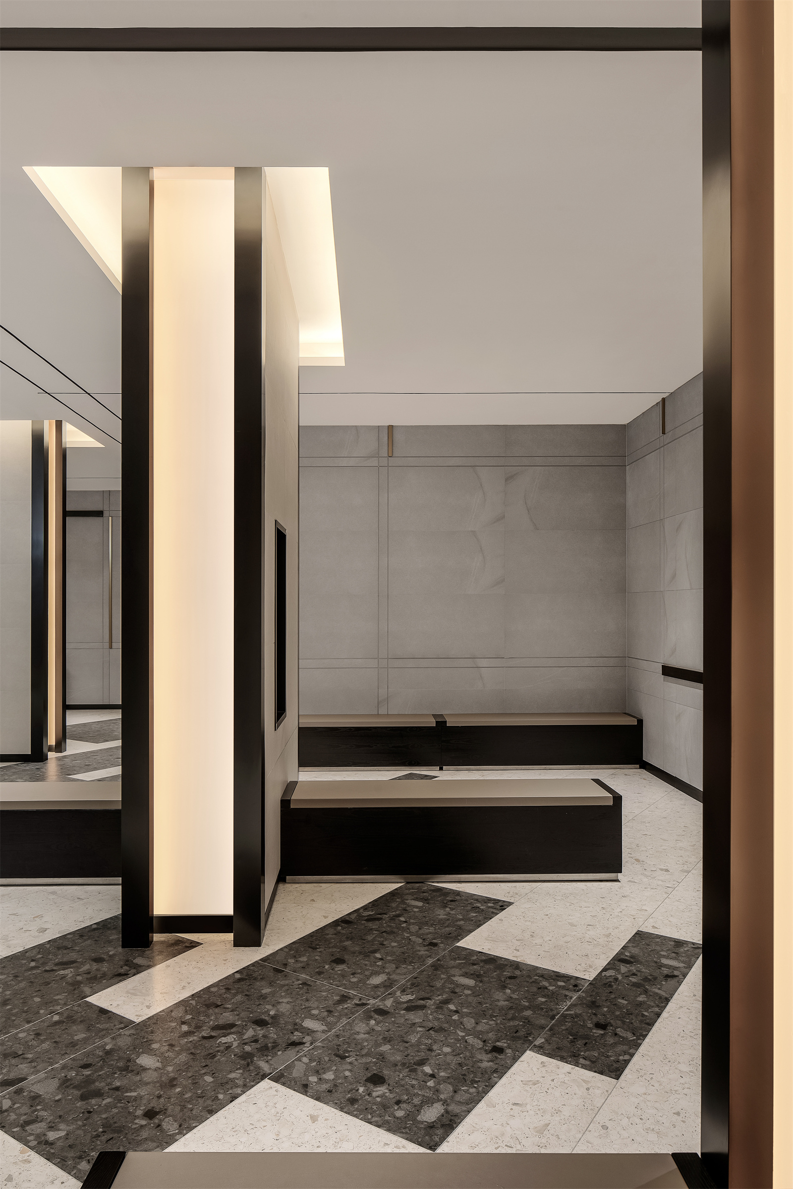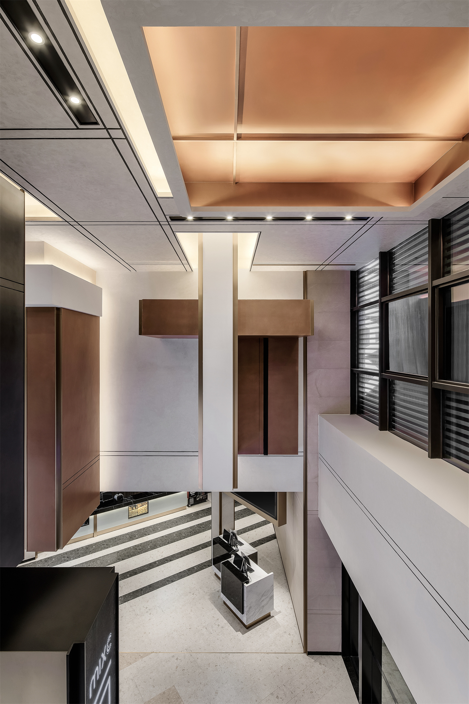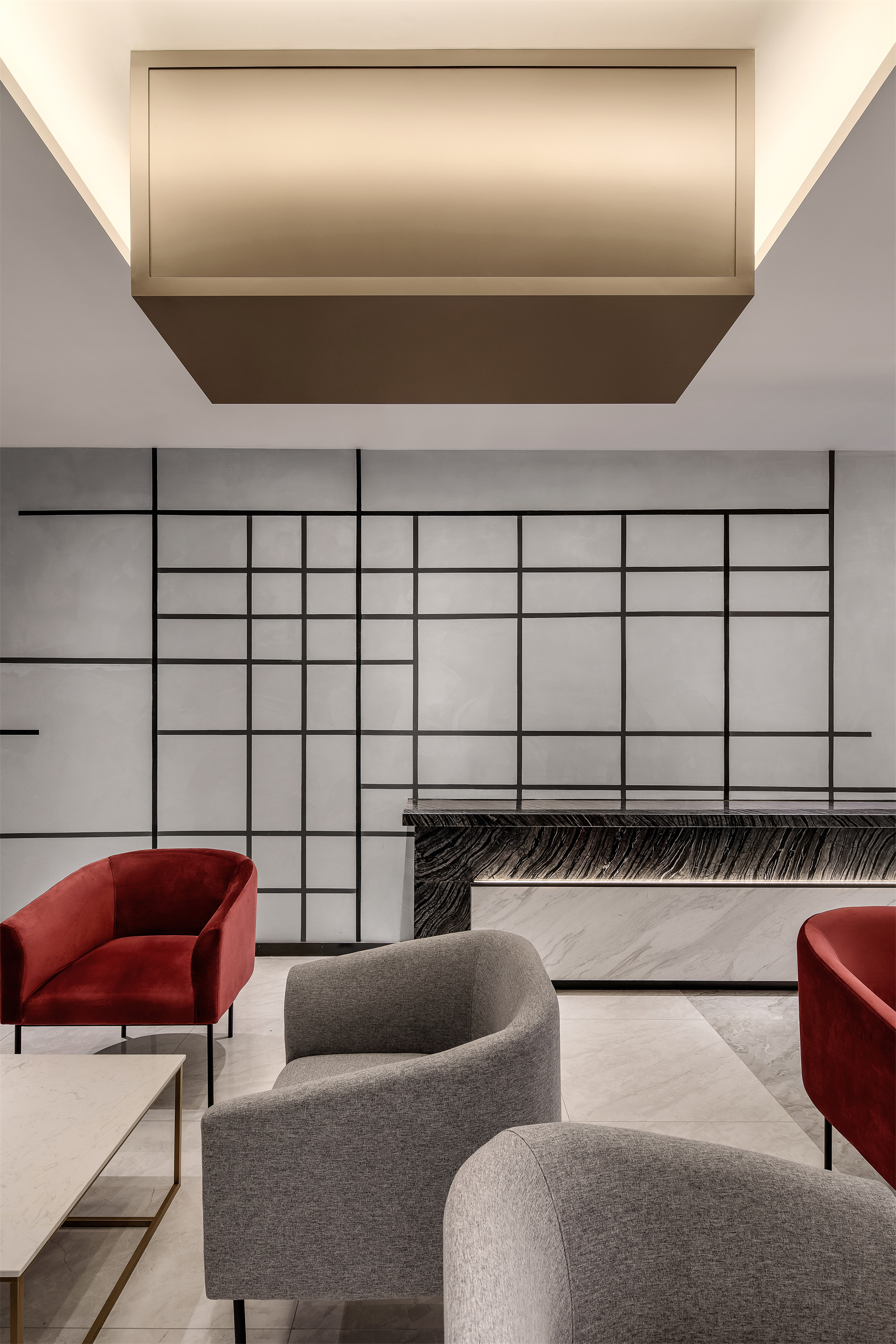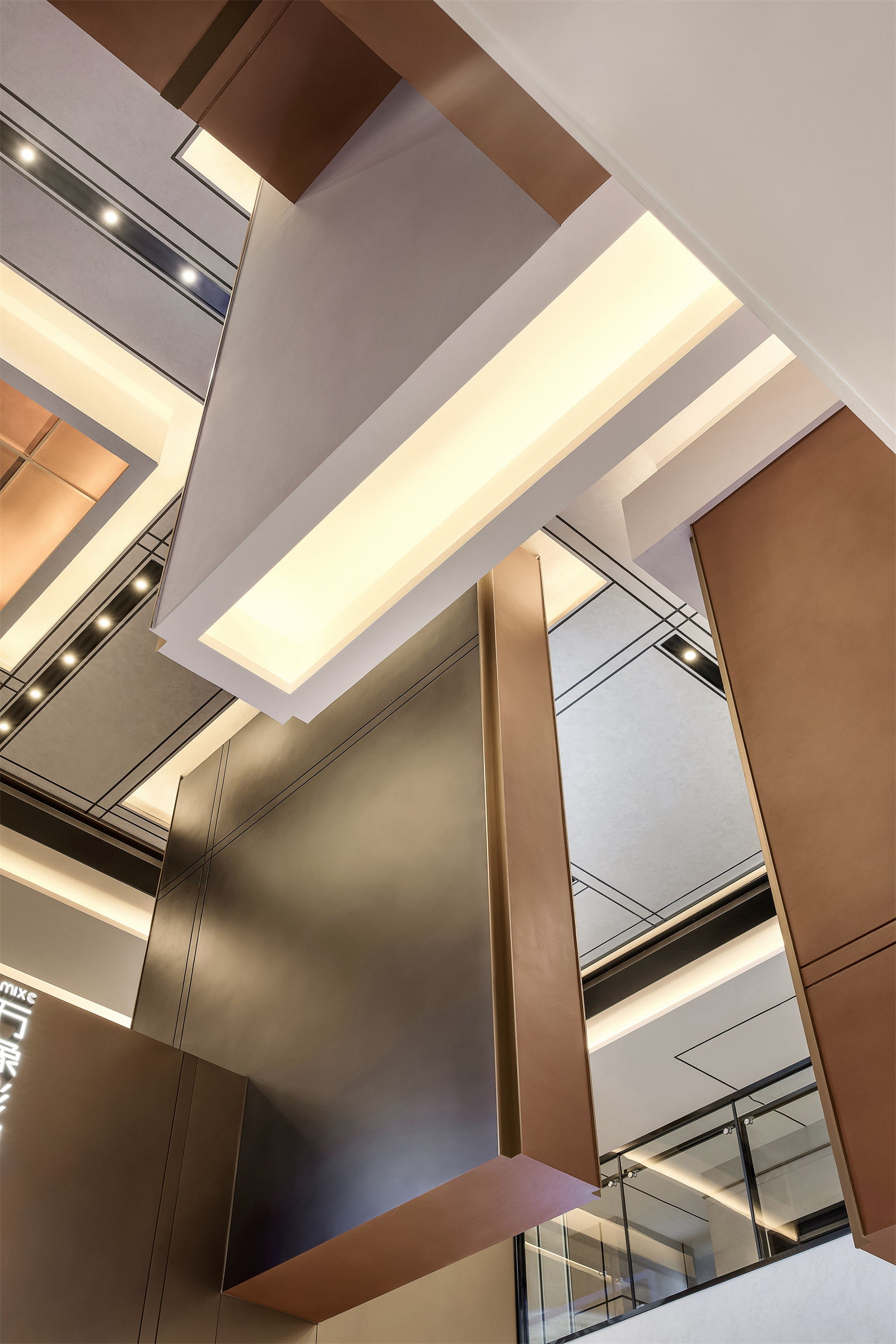 天花在仰视与平视不同的视角的切换下,呈现出截然不同的面貌,在复杂多变的组合下,线条彼此穿叠和连贯,打破了原本枯燥的秩序。正如俄罗斯方块通过不停制造方块来抓紧我们的神经一样。