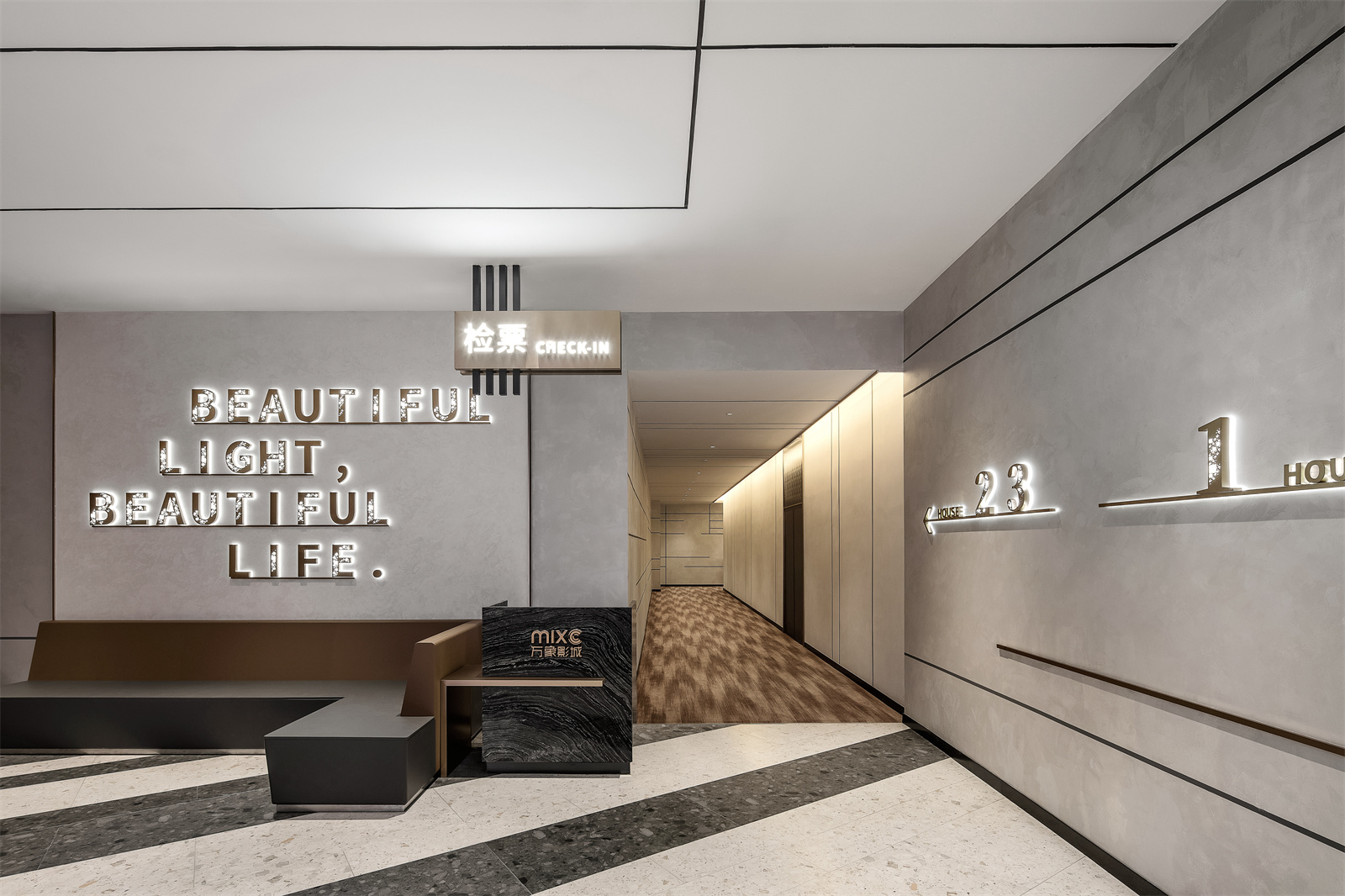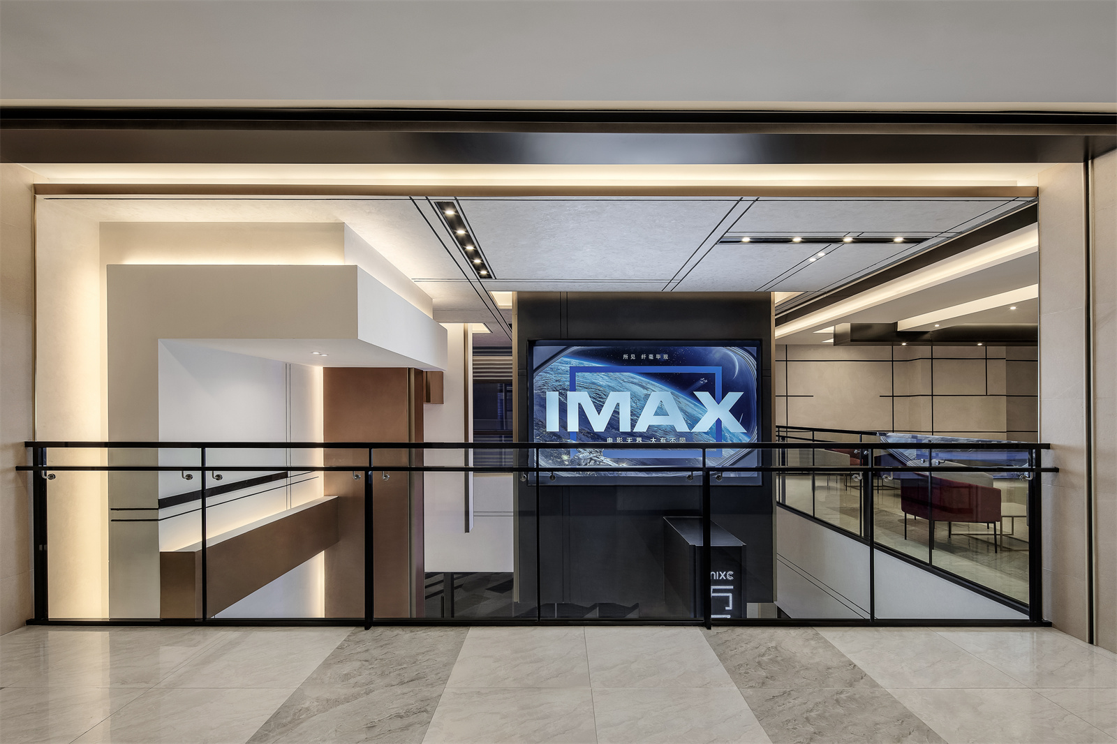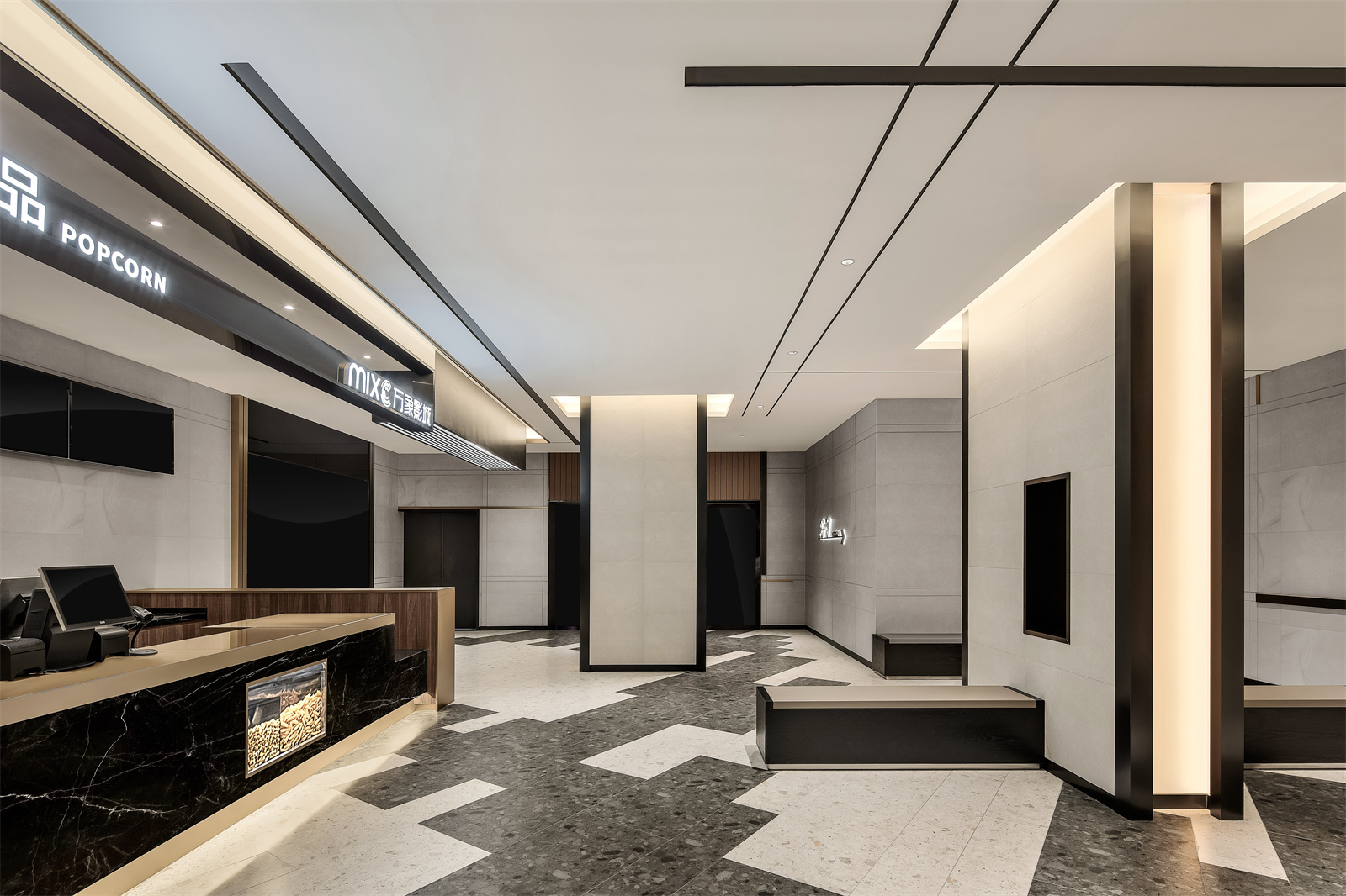 当通过电梯抵达二楼,天花上无限延展的黑线和铝条,不仅形成更为立体的视觉,还构成了视觉引导,线与面的几何设计始终贯穿整个影院。
