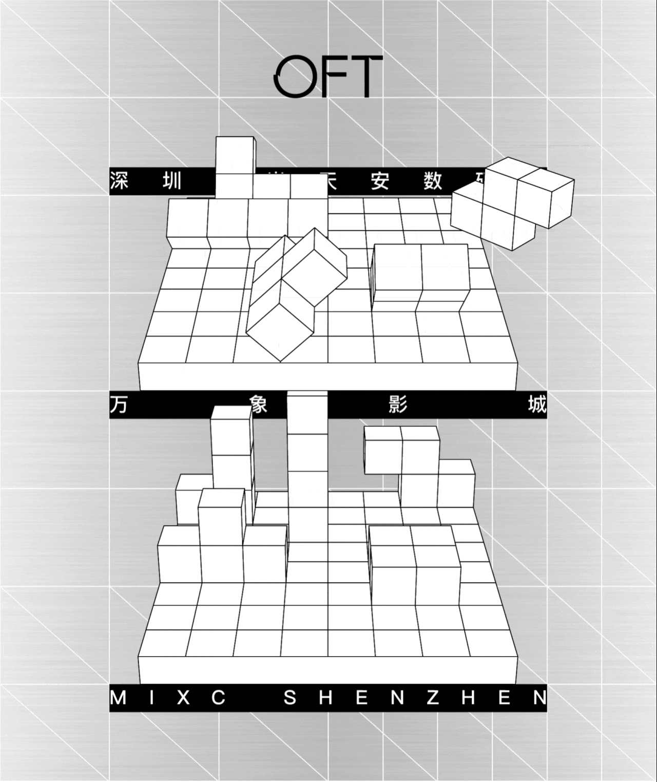 OFT设计从该园区“城市万花筒”的规划概念中,挖掘万花筒内在原理,创建出“解构”与“凝聚”环环相扣的超现实俄罗斯方块游戏空间。