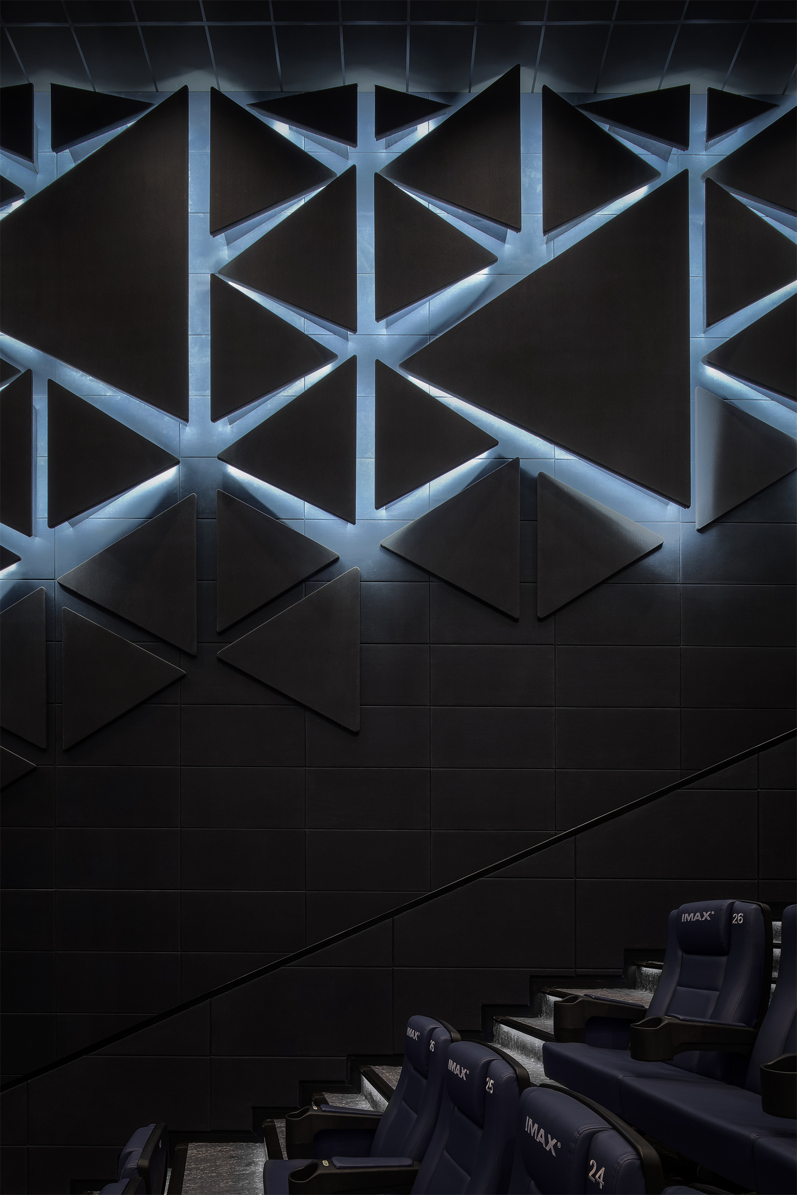 IMAX影厅中,两侧墙面是由扪布做成的冰雪浮雕,对称代表着原生的秩序,而渗光的独特造型则是叛逆下对稳定的突破。
