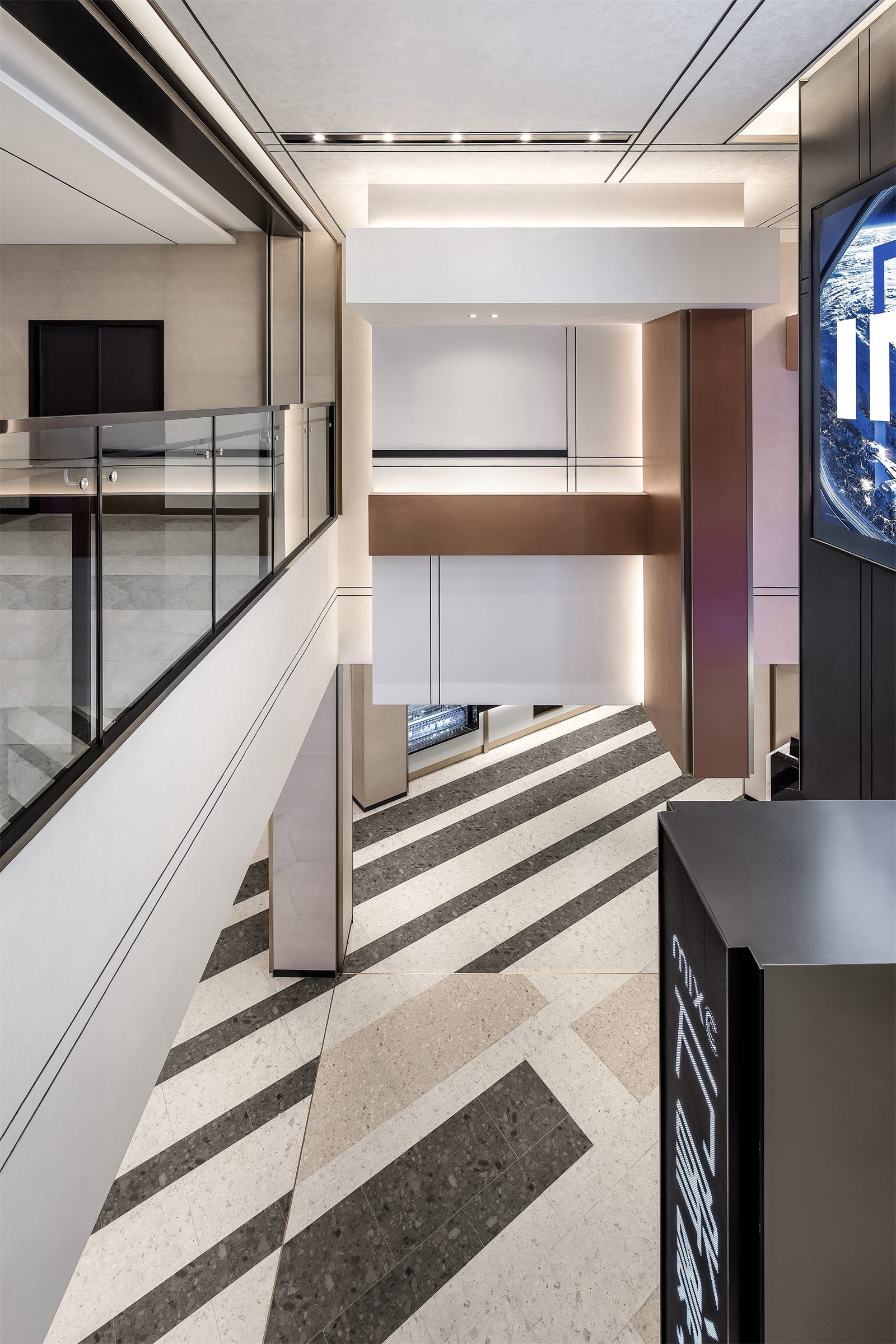 大堂是俄罗斯方块的试验场,贯穿两层空间的天花,是一个正在进行中的俄罗斯方块游戏,不断掉落的方块进行随机组合,在混乱中寻找秩序。