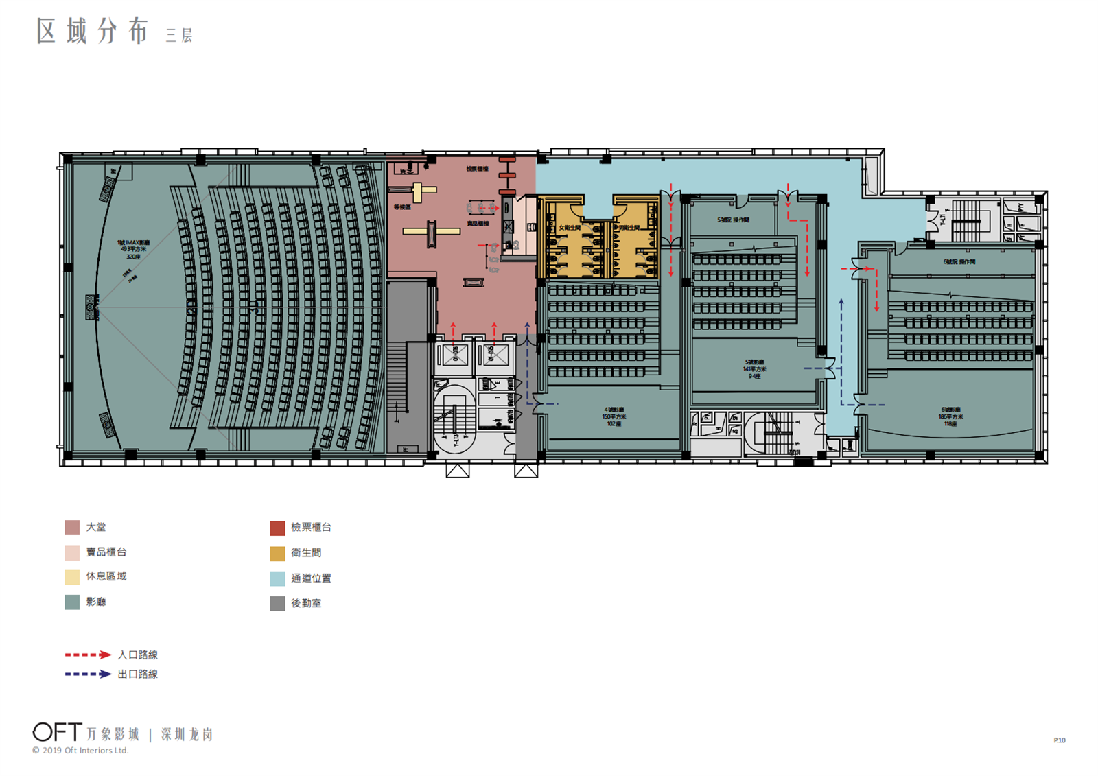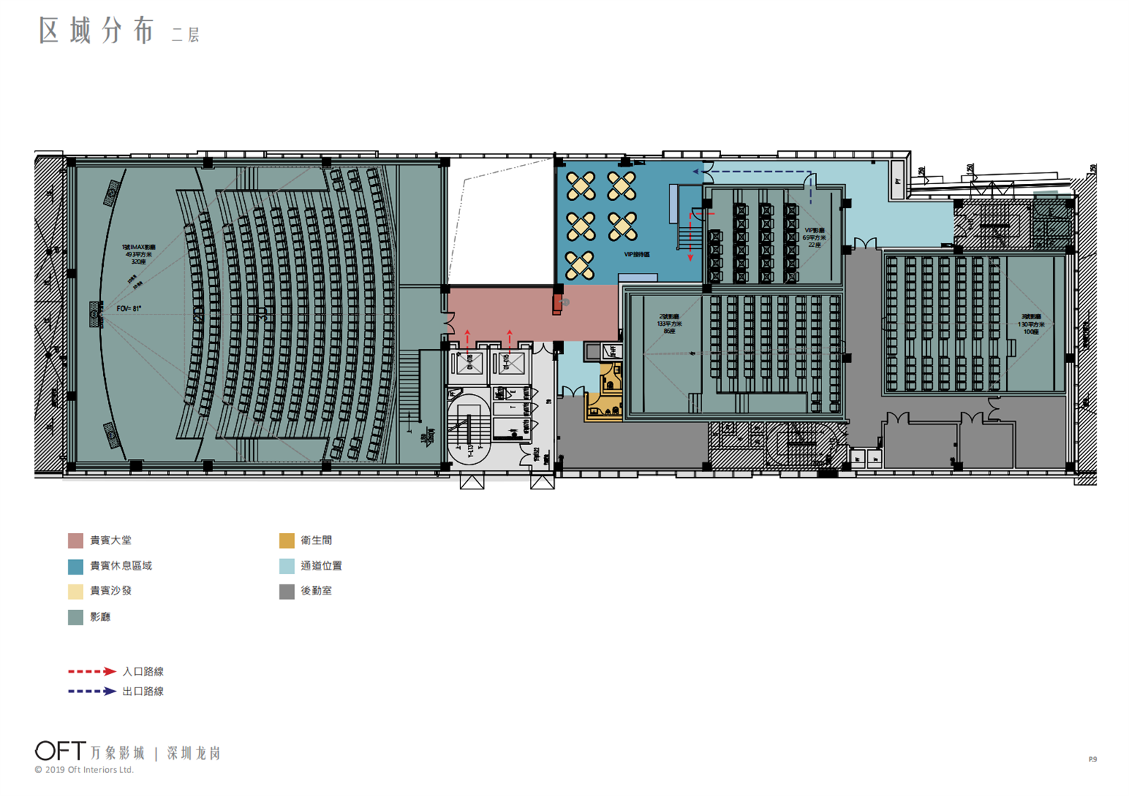 从平面布局上可以看到,一层是大堂与1个IMAX影厅和两个普通影厅组成;二层是VIP影厅及休息区;三层则是大堂与另外三个普通影厅。