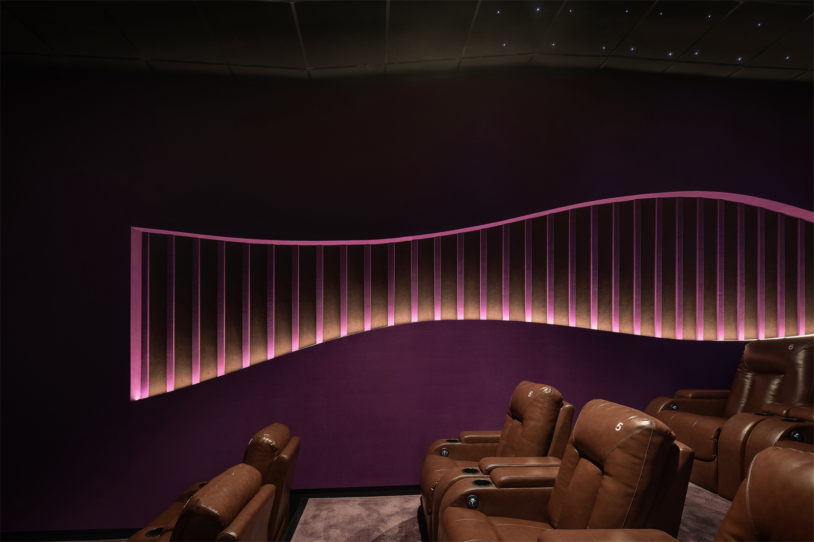如果说巨幕影厅在扪布浮雕造型和渗光设计下,成为一个冰山之下的异世界,那么VIP影厅则在光源的巧妙营造中,构成一条于宇宙群星闪烁中流动的星河。