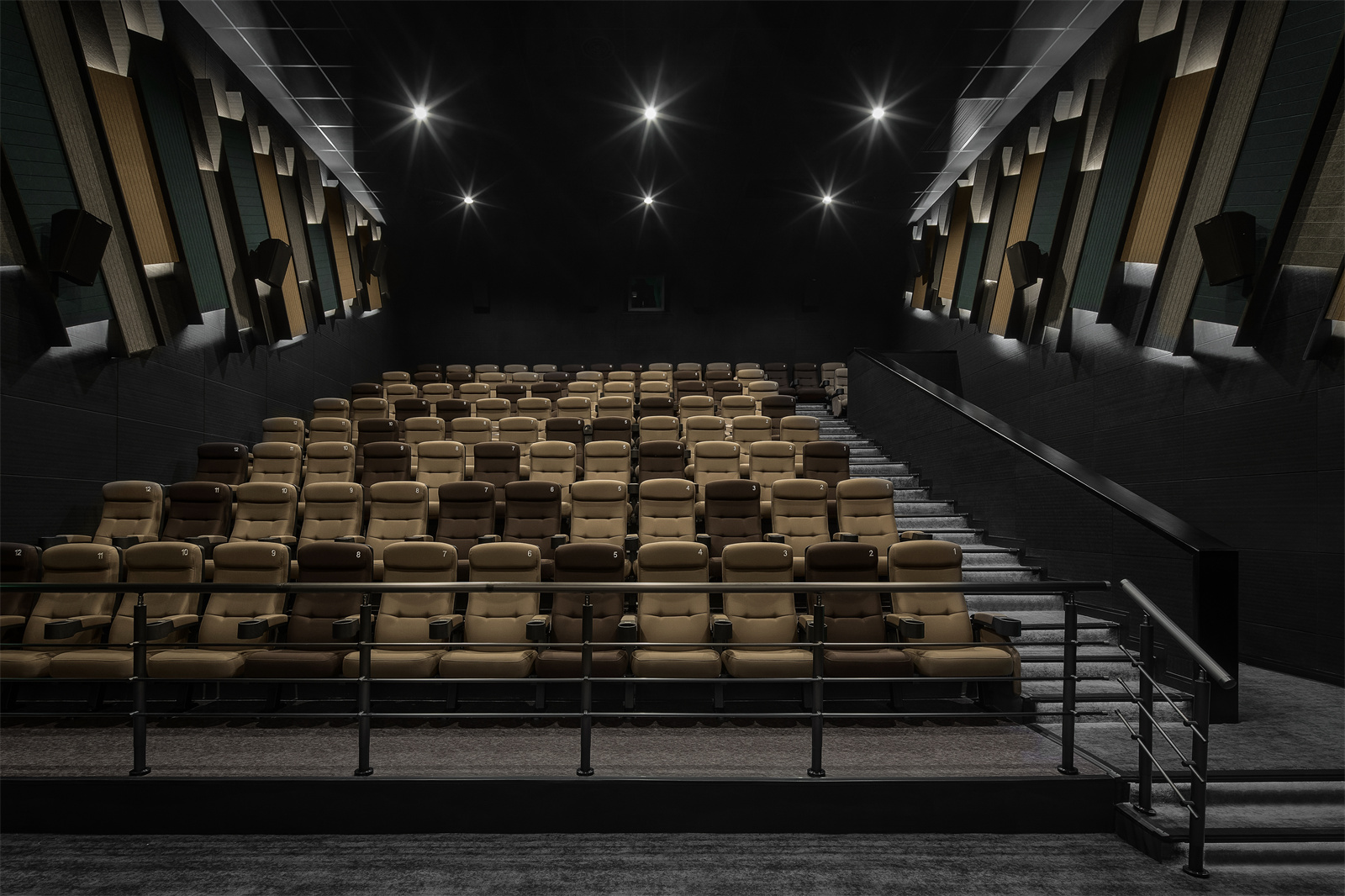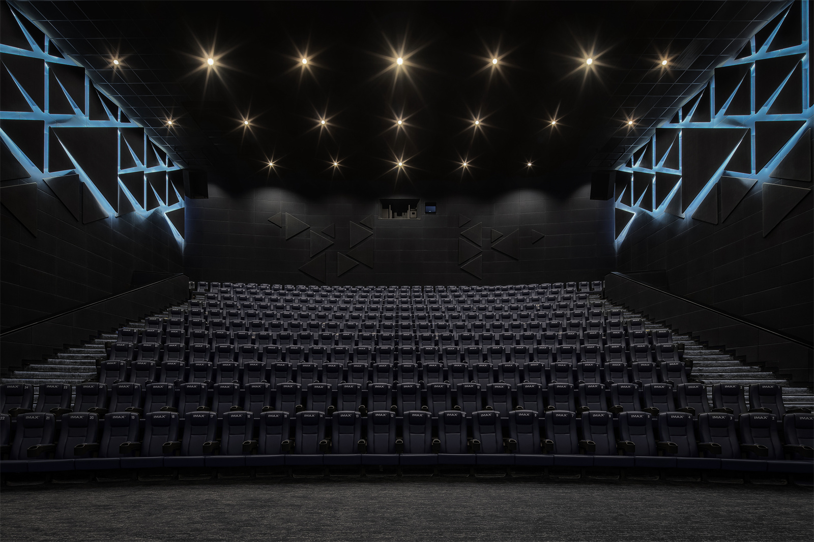 影厅中的座椅间隔有序,由相邻色随机构成,天花闪烁射灯,当电影尚未开始,就已然踏进异世界。