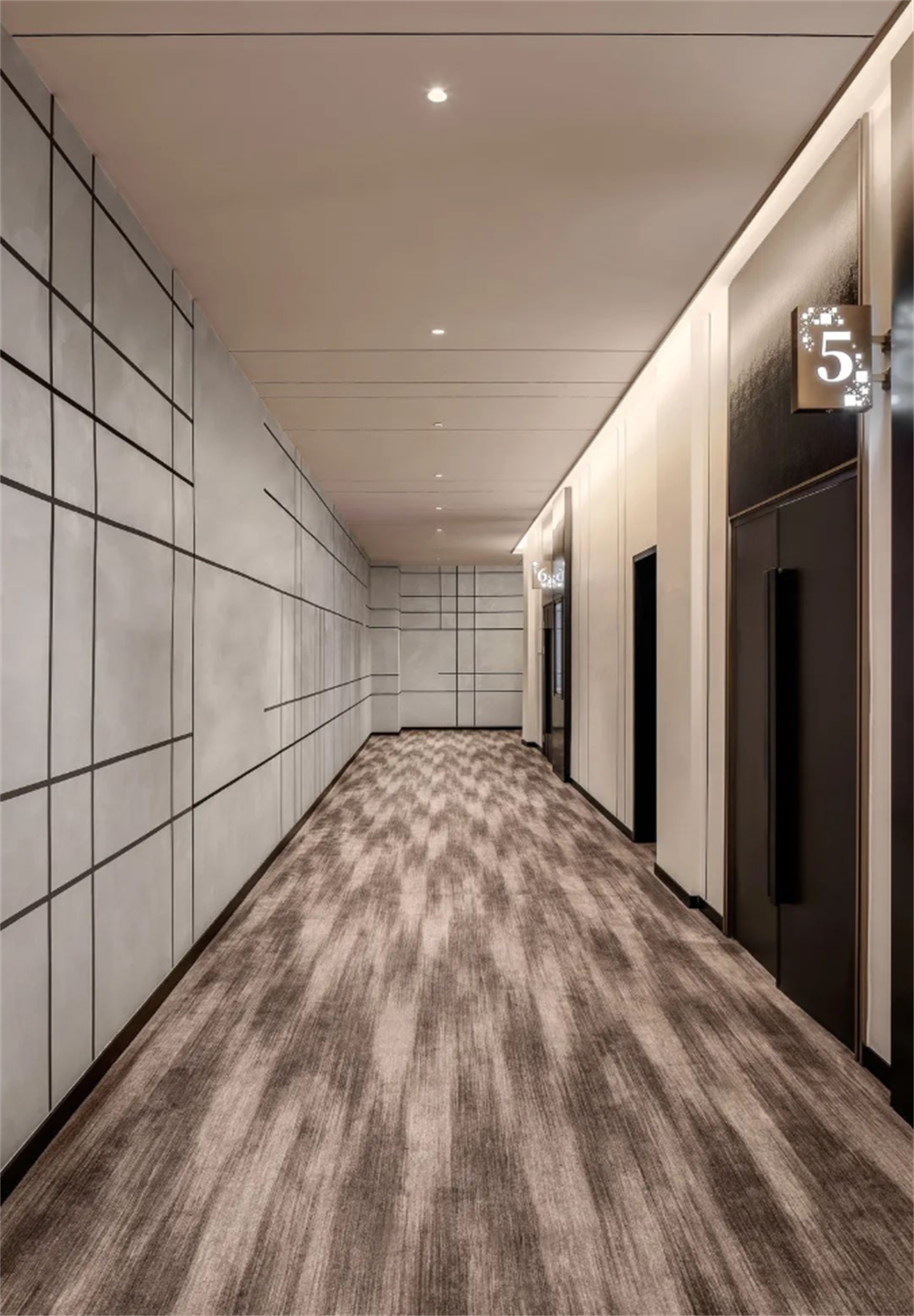 走廊同样由线与面这两个基本元素构成,铝板和喷漆板是不规则的线,紧贴着原本枯燥的墙面。