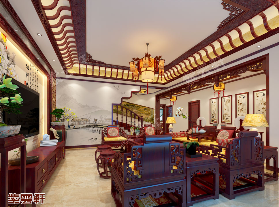 客厅,造型考究的明代红木沙发混搭金黄色和红色的软垫,复古又舒适。颇具复古风情的红木花格铺着在天花板与墙面上,很有那种大气沉稳的感觉。配上中式风格的吊灯,这感觉太舒适了。整个客厅中的装饰以红木为主,引入自然风景,更有一种本源之美,别墅室内装潢让生活回归本性,让家居回归简单。