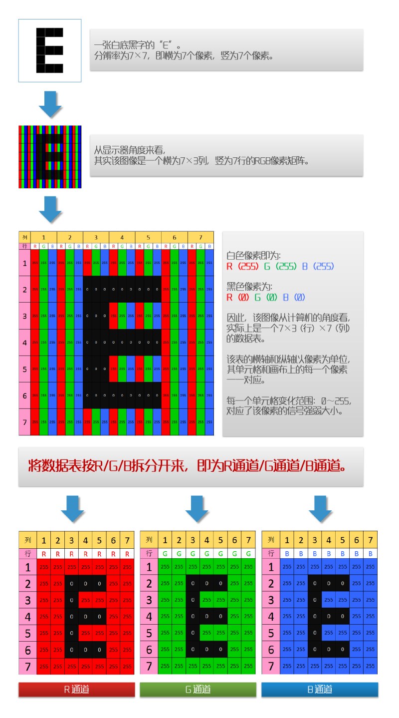 第一个表存储所有像素的红色信息(R通道),第二个表存储绿色的信息(G通道),最后一个表存储蓝色的信息(B通道)。