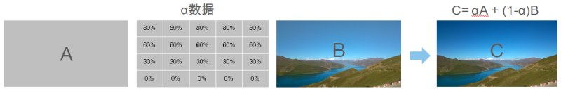 如果利用Alpha通道的办法来实现,则图A原图是全灰的图像,Alpha通道是一个透明度从上到下、从1到0渐变的数据表(示意图已大大简化,不然眼睛都要花了)。计算机再根据每一个像素的值,用αA + (1-α)B计算出新的合成图像。