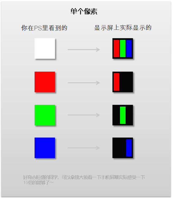 上一章我们介绍了,RGB显色系统里,一个像素实际上是由3个(RGB)子像素构成的。这是RGB系统能实现不同颜色的基础。