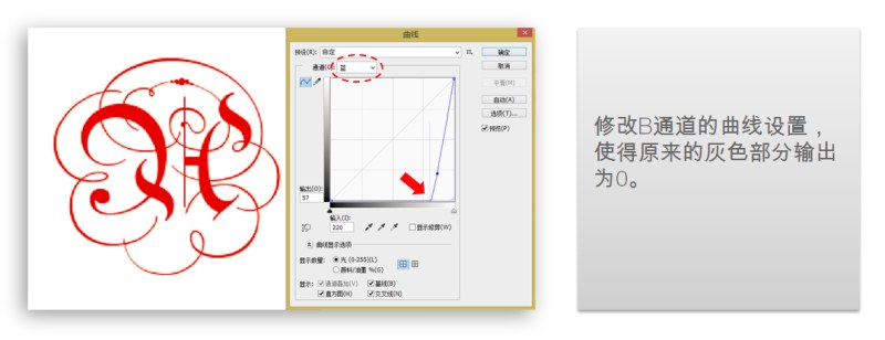 所以,参照G通道,对B通道需要做的应该是,保留白色,把灰色的部分变成黑色。这样的情况可以用曲线工具来调整,修改B通道的曲线,使得原来的灰色部分(分布数量最多的那部分)输出为0。
