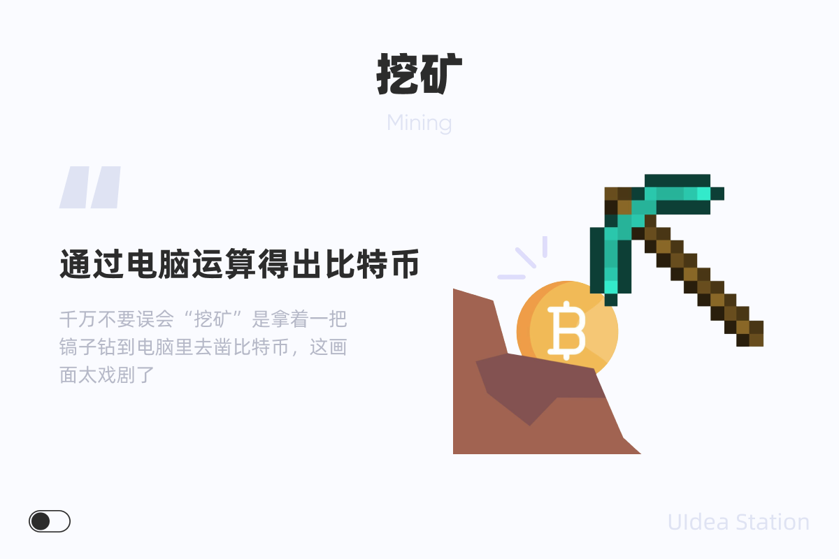 “挖矿” 这个词因为比较生动易传播,所以即使并不关注 Web 3 的同学可能也会经常听别人提到过,这里所指的的挖矿其实就是获取比特币的过程,不过千万不要误会“挖矿”是拿着一把镐子钻到电脑里去凿比特币,这画面太戏剧了,本质上我们现在所谈论的“挖矿”是通过电脑的程序运算得出比特币,前面我们提到:分布式节点是不同的节点一起去记账,而这个记账的过程其实就是做一道非常复杂的数学题,第一个算出来的就有权利在账本上记账,并且获得一定的比特币奖励,这个过程被我们称之为“挖矿”,而那些做数学题的电脑就被叫做“矿工”,其实这也是根据我们原始的货币获取方法所命名的,很早之前我们获得的金银铜铁等这类货币的方式其实就是地下挖矿得来,而现在的 Web 3.0 就像是一个新世界的诞生,所以热衷于该世界的人就将这种技术称之为 “挖矿”了。