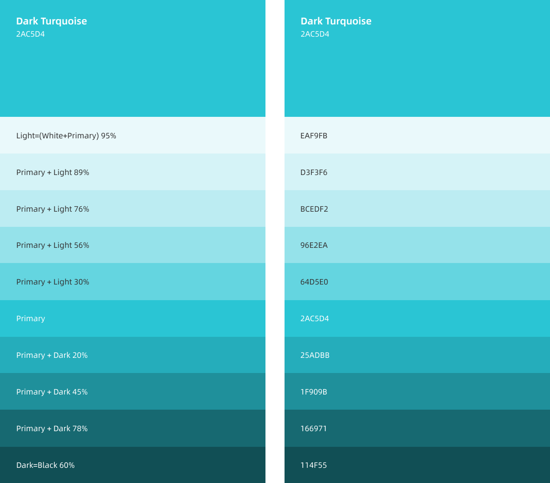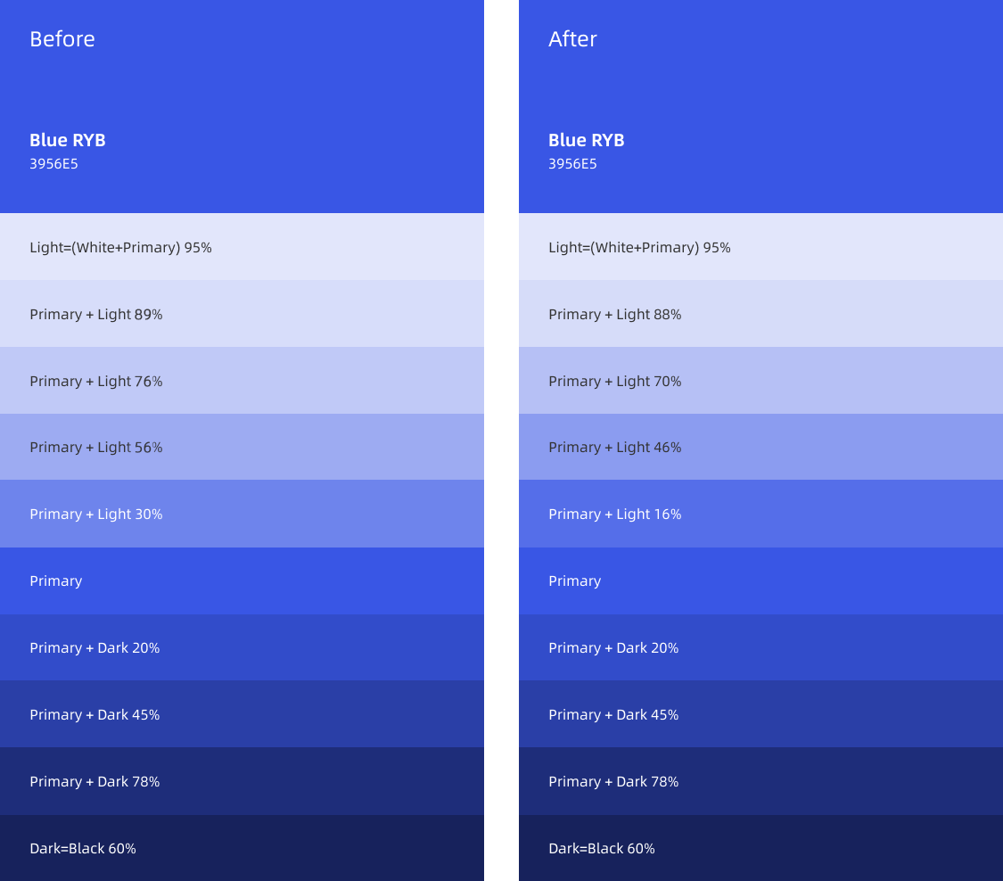 校正主色和辅助色后,我们需建立完整的梯度色板,来满足不同场景下颜色的应用。建立色彩层级,以提升品牌感知,达到信息传达辨识、强化界面层级等作用。