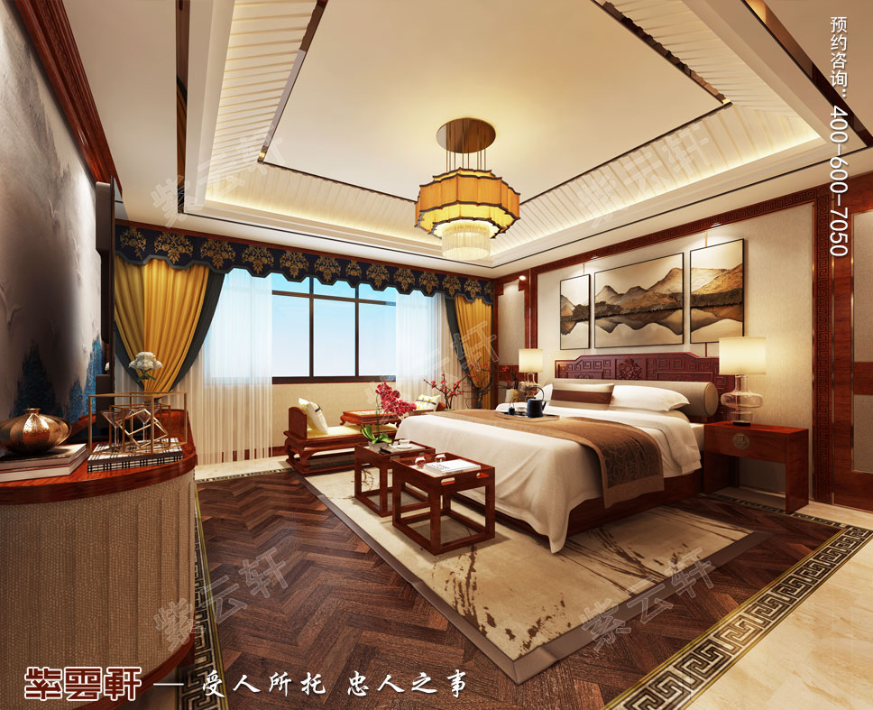 卧室,庄严有序的中式花格护墙板搭配古风文艺画,沉稳有度的木件让温馨的卧室中多了一分文雅的内涵。中式住宅装修中,地面做部分木地板设计,这种现代大理石与原生态木材结合的创新设计,比千篇一律的瓷砖效果要耐看许多。
