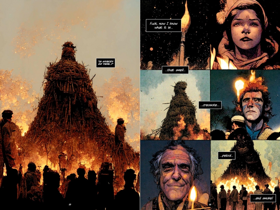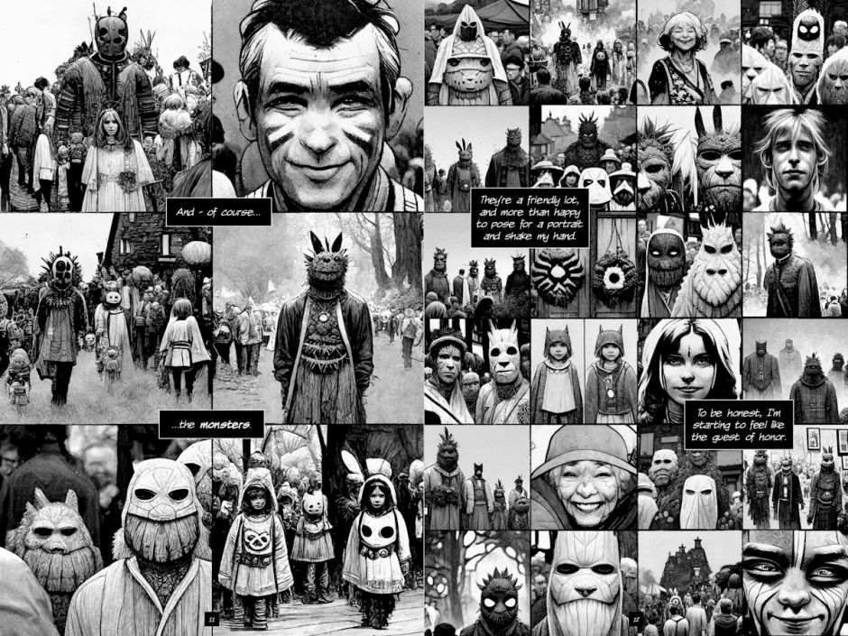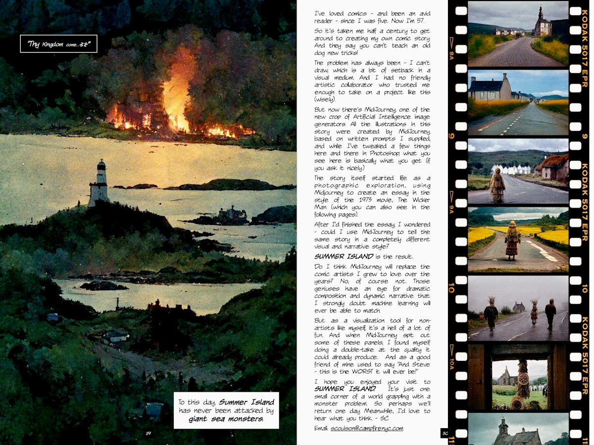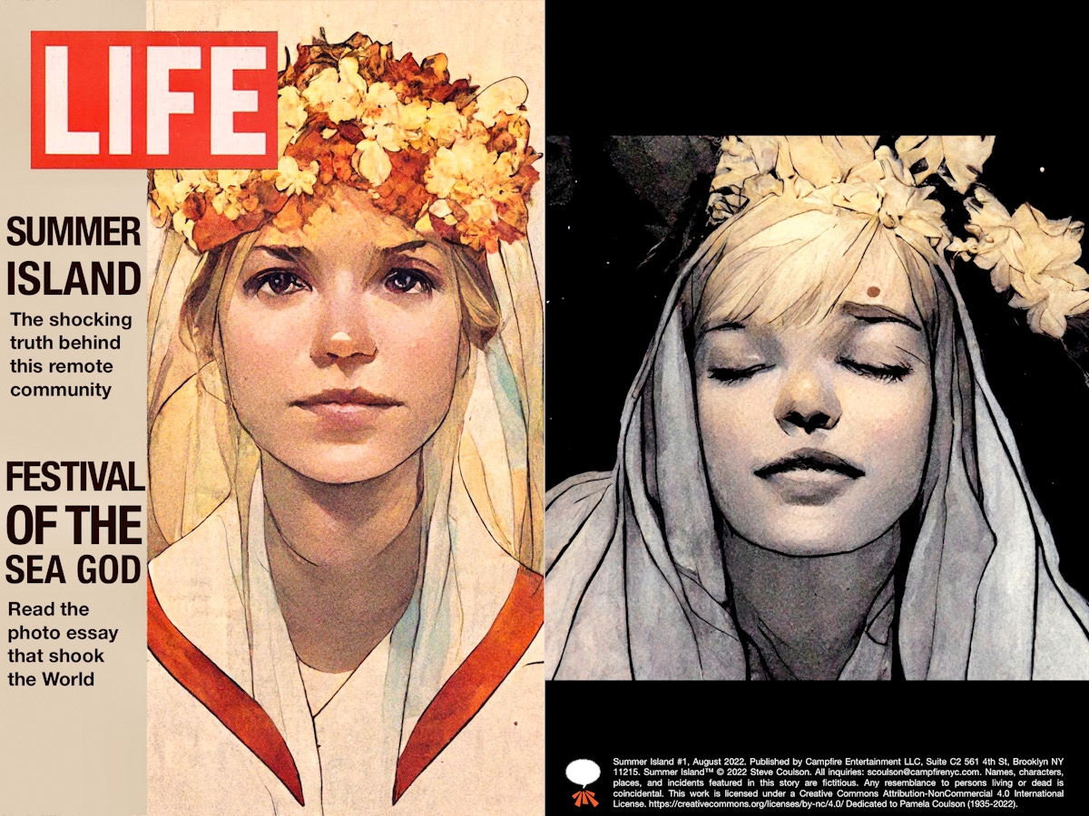 在这场争吵中,我们看到了《夏日岛》:一部由史蒂夫·库尔森 ( Steve Coulson)撰写的引人入胜的 40 页民间恐怖漫画,作品由Midjourney AI 生成。我已经看到了一些人工智能辅助讲故事的尝试,并觉得 Coulson 在他的短篇恐怖故事中以一种聪明的方式使用人工智能图像生成做得非常出色。欣赏地址:https://campfirenyc.com/summer-island/