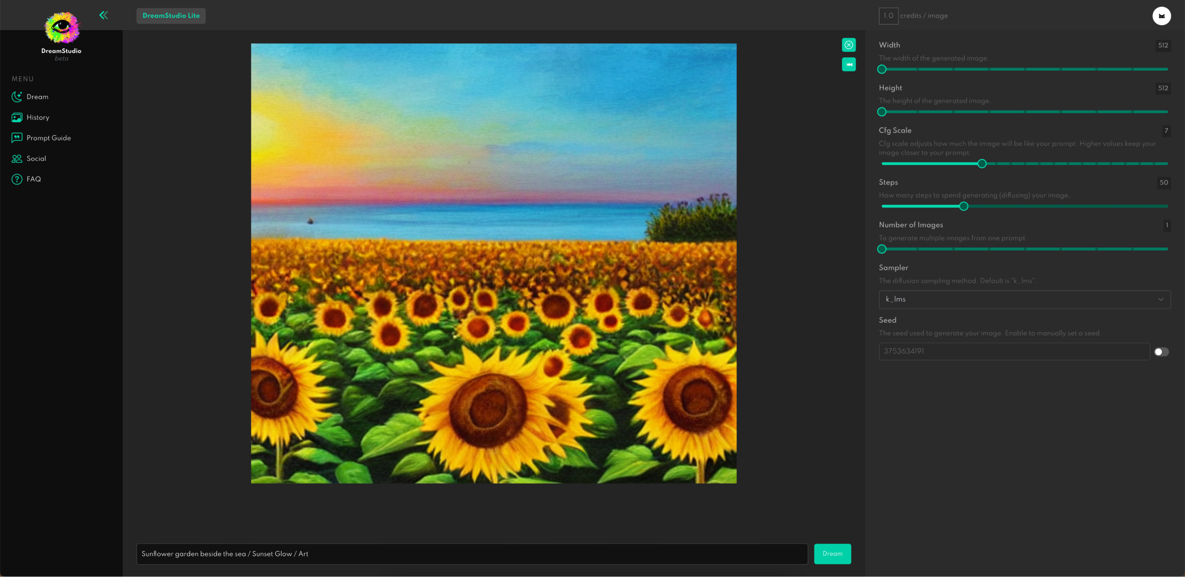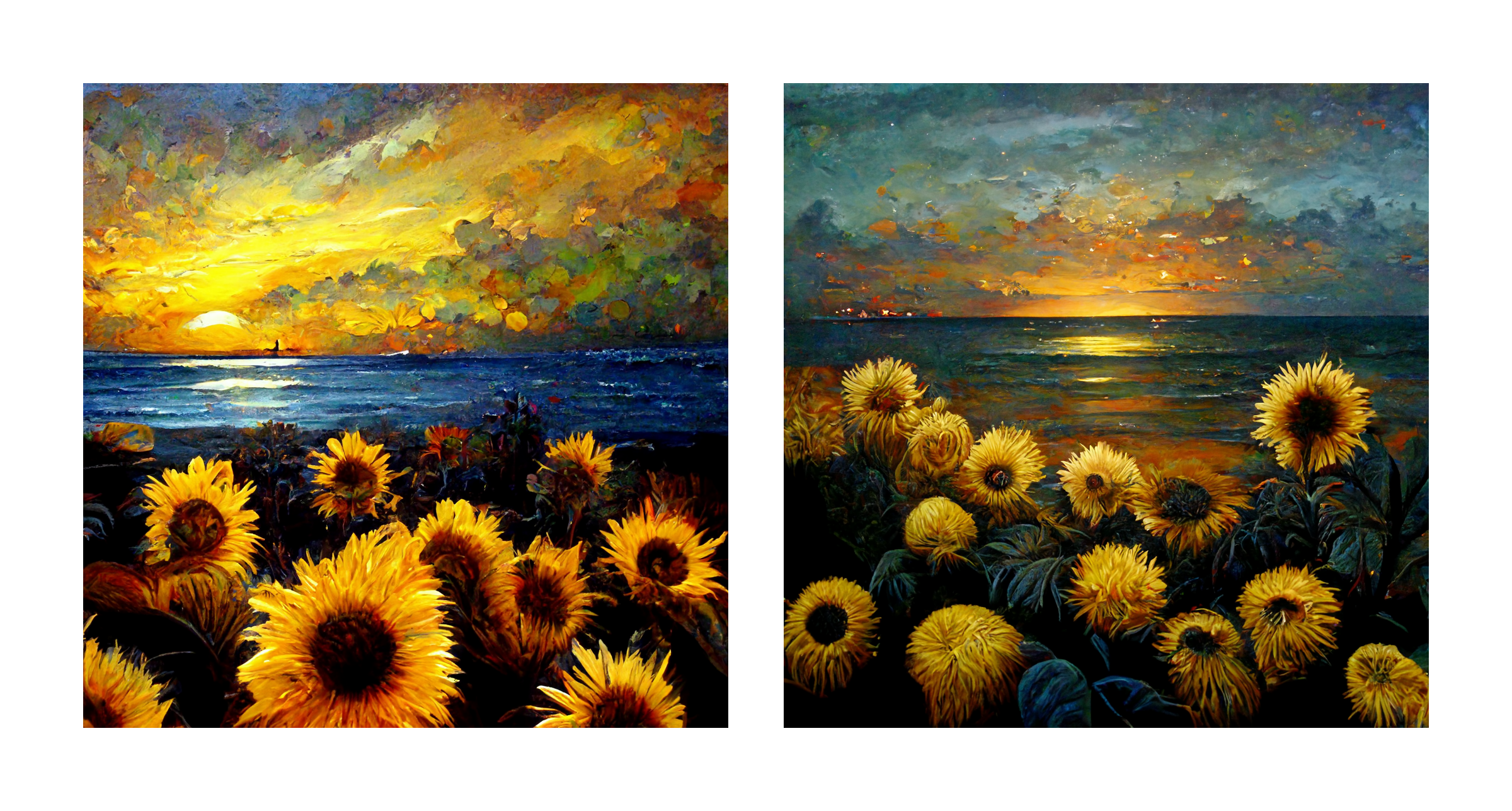 Stable Diffusion 目前已经开源。其特点是出图快速精准,且运算模型越来越小,模型量由之前的7G到2G到模型最终会压缩到100M左右,可以在消费级图形处理器上运行,几秒钟内就可以生成512x512px的图片,这也是工具开发者希望AI绘画能够平民化以真正探索潜在空间的边界。该模型每天有超过1万名人员在测试,每天生成超过170万张图像,下面我现在依旧用“大海旁边的向日葵花园/晚霞/艺术”这组关键词来测试下这个工具的呈现效果。