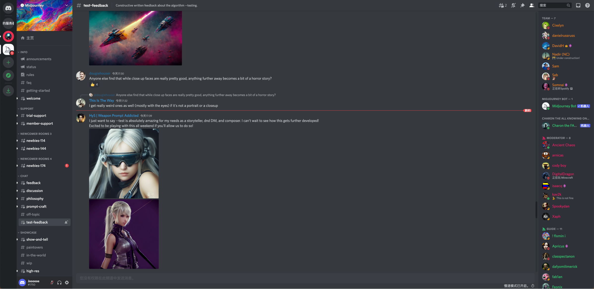 Midjourney 是一款搭载在discord上的人工智能绘画聊天机器人,Midjourney公司的核心成员之一也是开源AI绘画程序 Disco Diffusion 的作者Somnai,感兴趣的可以去他的推特上看看。相对于 Disco Diffusion 需要一定的代码基础不同,Midjourney 基本上是零成本学习,操作非常的简单。其画面更加具象真实,且是个全面手,没有特别不擅长的画面。