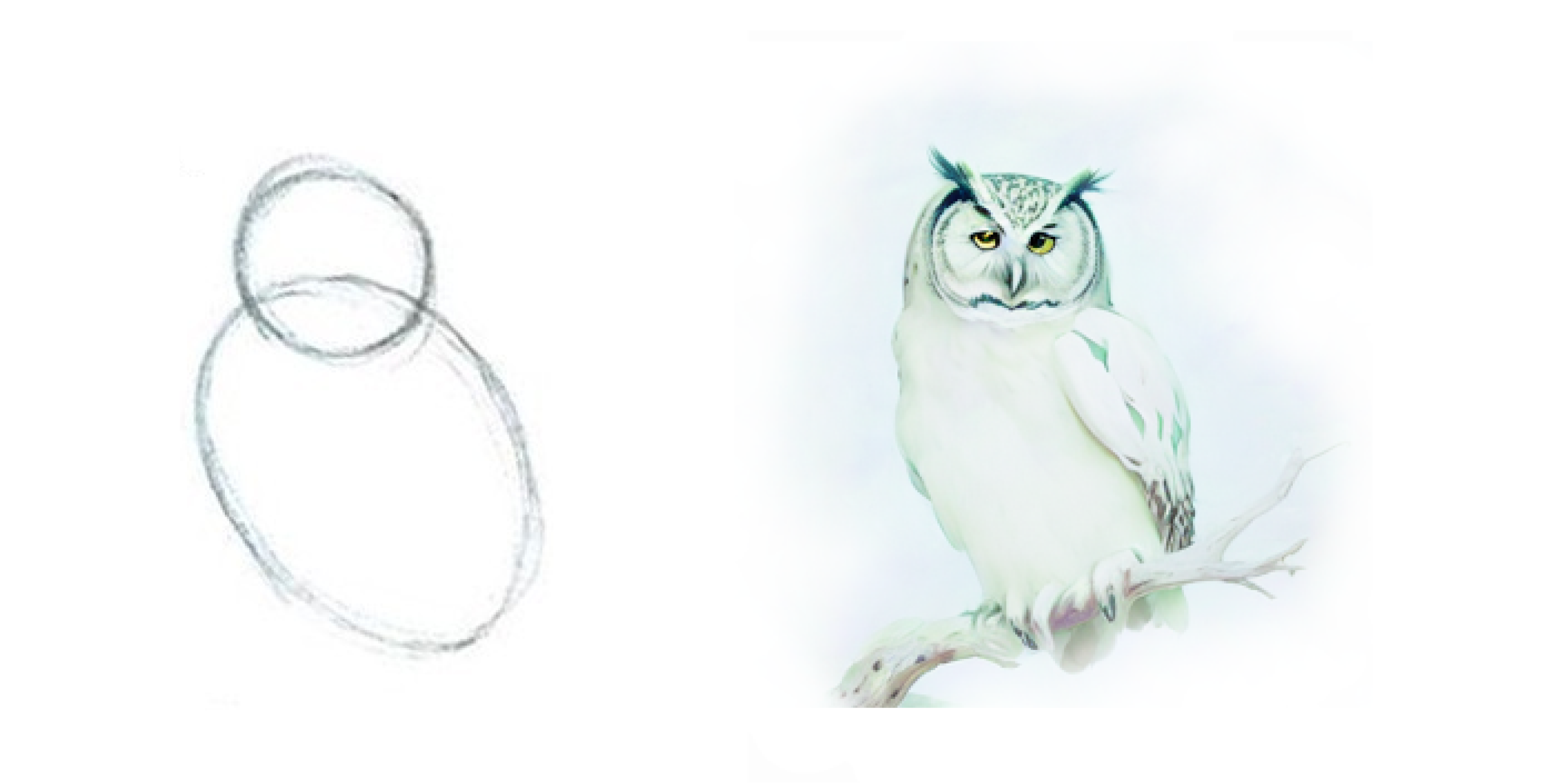 最后我们来看下如何画一只猫头鹰,只需要两步:1、画出两个圆 2、添加些描述词,你就会得到一张猫头鹰图像,是不是很哇塞。