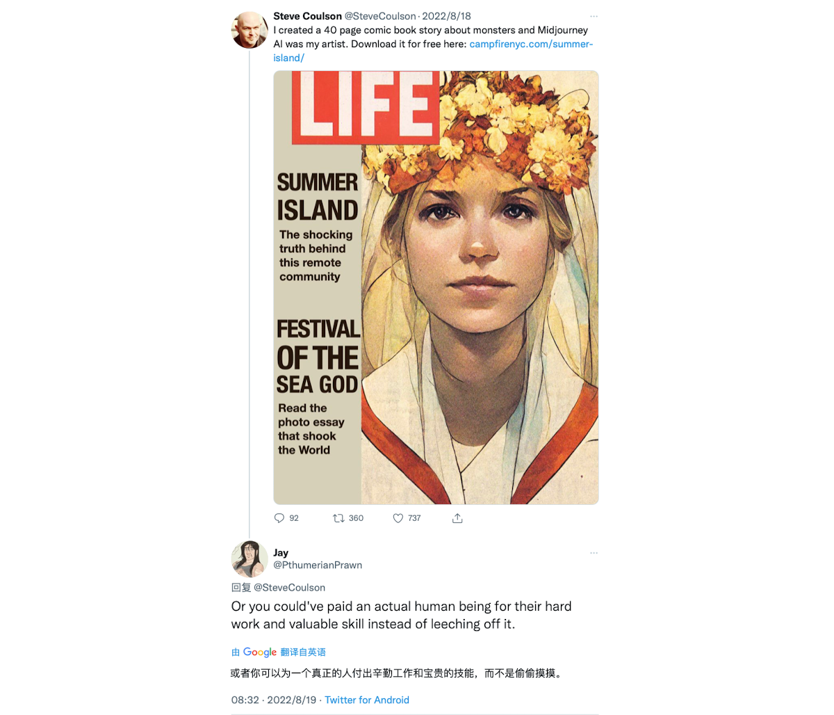 当史蒂夫在推特公开《夏日岛》的时候,也是被很多艺术家锤了,主要是艺术家宣称:“这是不道德的!你应该聘请艺术家来做这件事!” 在一个非营利项目上,同样如此。不管怎样,大部分都是出于艺术家的恐惧,他们认为 Midjourney 会抢走他们的工作。他们对技术的承诺和危险有着相互矛盾的情感反应,这两者的平衡取决于以创造性而非剥削的方式使用它的人的创造力、智力和道德。但这就像看到海啸来了,你可以被它击中,也可以尝试冲浪。不管怎样,它来了。