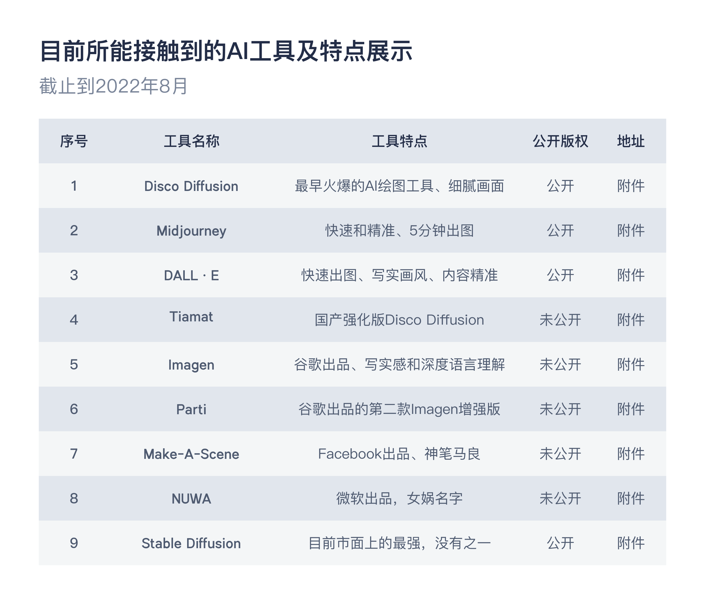 随着最强的Stable Diffusion的正式开源,也意味着新时代的开始了,基于现有的开源模型开发的设计工具和插件也将井喷,这也许就是AI绘画的第二个阶段的来临未来形态的一个雏形,这将不再局限在 Text-to-Image 了,开始往 Inpainting(图像修复 )和 Image to Image 方向发展了,最后不知道会颠覆哪个行业,我们拭目以待。这里也整理了些目前所能接触到的AI绘画工具一起看下。体验地址和内侧我也一并放到附件里了。