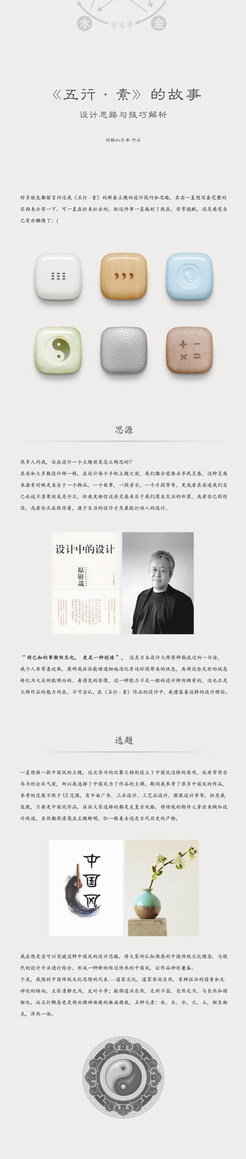 好多朋友都留言问过我《五行-素》的那套主题的设计技巧和思路,其实一直想写套完整的东西来分享一下,可一直在忙来忙去的,把这件事一直拖到了现在,非常抱歉,还是感觉自己有些懒惰了:(