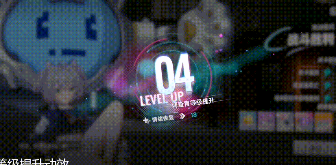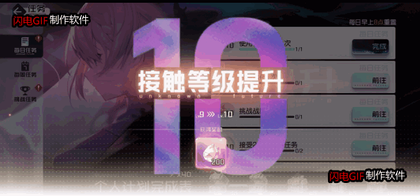 接下来数字“10”非常快速的闪出,且大小几乎占据了画面的近1/3,并伴随高亮的“接触等级提升”文字和横向矩形光效,给玩家带来了视觉上的冲击,也凸显了等级的提升。