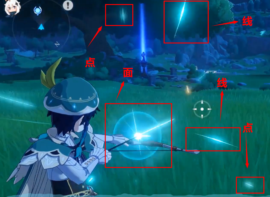 从静态截图中可以看到,聚气中心能量对应“点线面”中的“面”,向中心汇聚的粒子对应了“点线面”中的“点”与“线”。