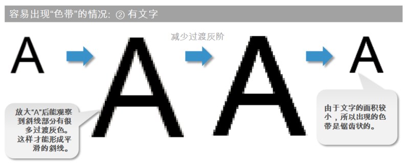 我们看到的文字颜色也许是黑色的,但其实文字的细节之处(特别是有斜线的位置),有很多不同的灰阶(过渡色)。所以文字的斜线部分也容易出现看起来像锯齿一样的“色带”。