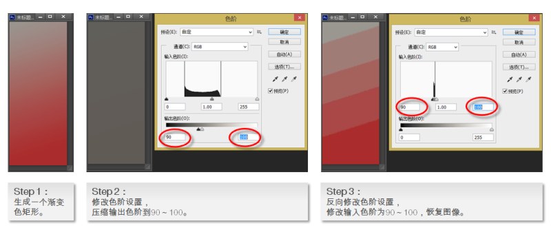 出现这个现象的原因,在于第一步开始压缩色阶输出范围的时候,过渡色的细节信息被“压缩”了,变成了一片色差很小的灰色。由于在计算机里由于没有分配空间存储这些被“压缩”的信息,这些细节只好被扔掉。恢复色阶后,这些信息也没地方找回来,所以只能恢复一个大概。这样,大量的过渡色被“吃掉”,最终形成“色带”。