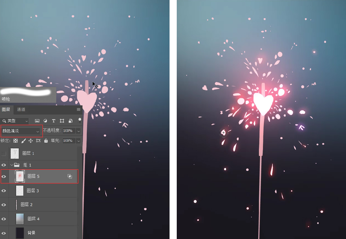 2.在花火的图层上新建一个图层(图层5),把图层模式改成:颜色减淡,双击图层右边空白处,打开图层样式,把混合选项中的“挖空”只勾选第一个选项,再用喷枪画笔选偏暖的颜色轻轻的画在火花上,发光的感觉马上就有了哦。
