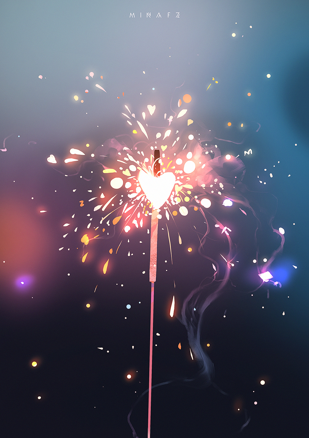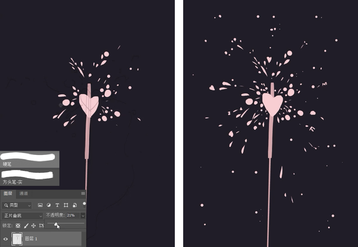 把草稿图层的模式改成正片叠底,不透明度调到20%左右,背景填充深色(不要用纯黑),再用“方头笔-实”画出烟花棒的形状,硬笔画出花火的形状。花火可以比草稿画的密集一些,也是要注意节奏对比哦。