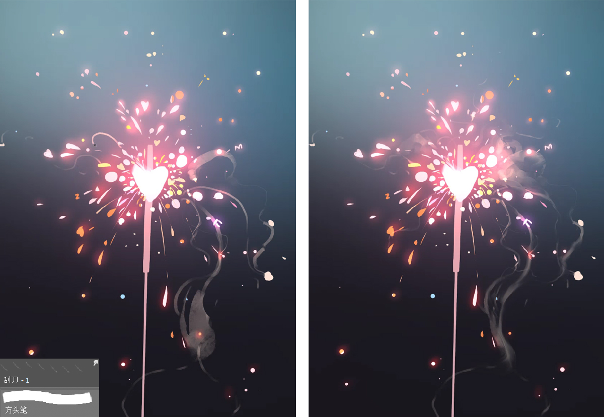 1.烟花棒上面用“带竖纹的肌理笔刷”加一些细节,最后增强一下光感。