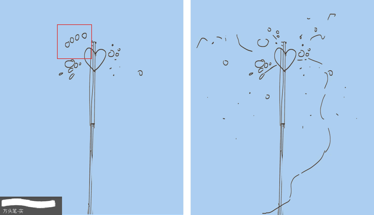 把画布缩小一些,新建图层,选用“方头笔-实”(硬边缘笔刷都可),根据照片把烟花棒的形状画出来,烟花中心的形状做了主观的处理:可以画成任意喜欢的形状,飞溅出去的火花根据疏密、大小的节奏去画(左图红框处一样的大小和间距就会显得太平均,缺乏对比)
