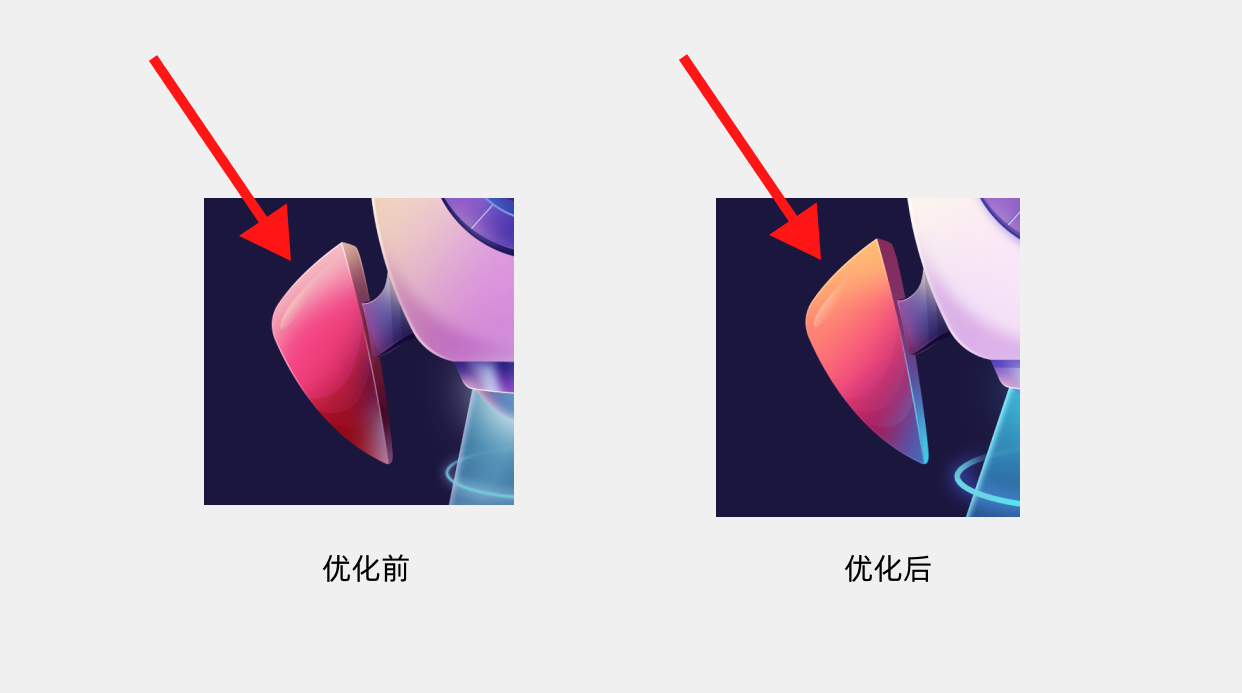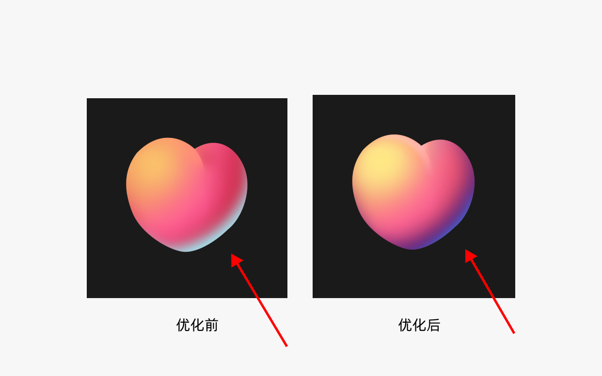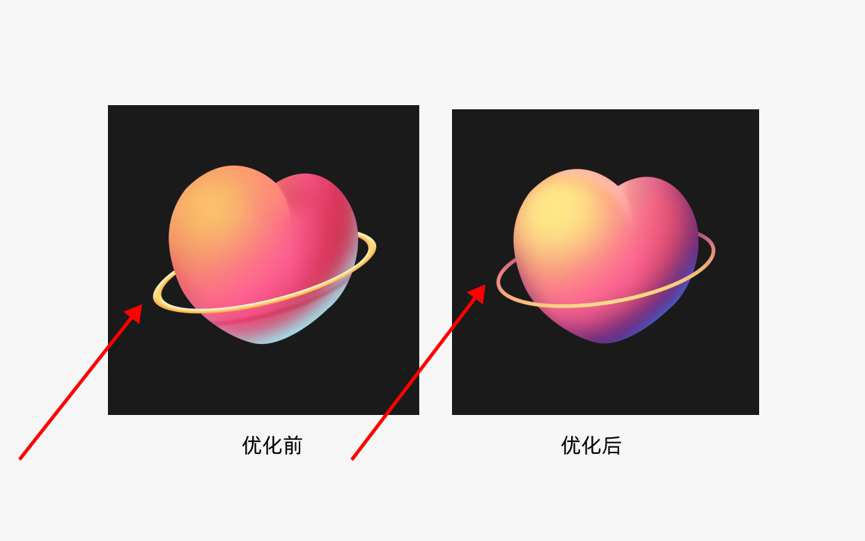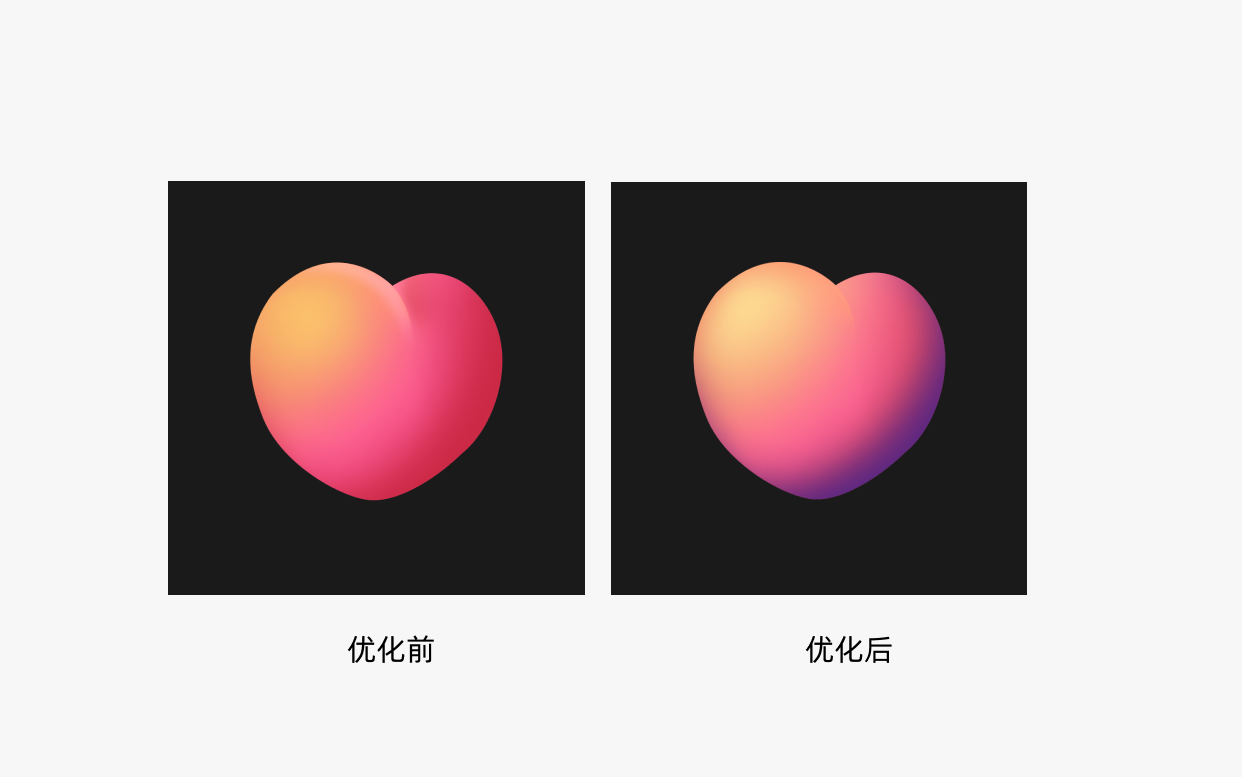 一般来说,反光颜色尽量需要有一些色相,高光偏暖,反光偏冷,这一点原版是有做到的,但是反光不用太过,反光和高光是有强弱对比的,反光一般明显弱于高光,如果反光抬强,会造成一个物体有多个视觉重心,那就不聚焦了,知道了这个知识点,我们再回去看对比,优化后的爱心,不仅弱化了反光,还强化了高光,目的就是为增强对比,变的聚焦!