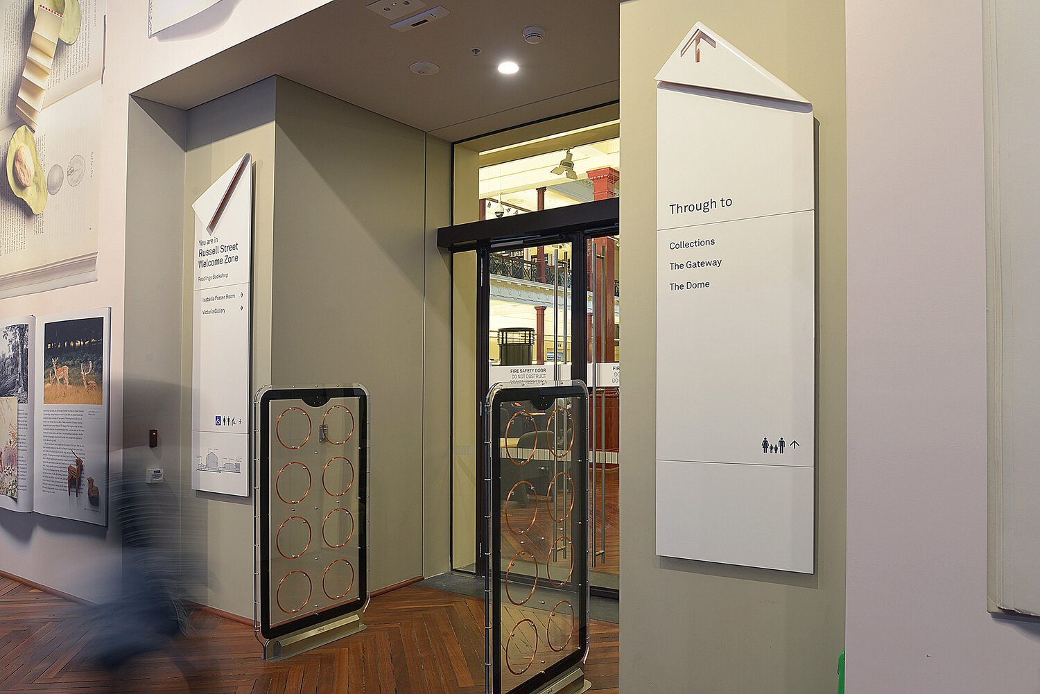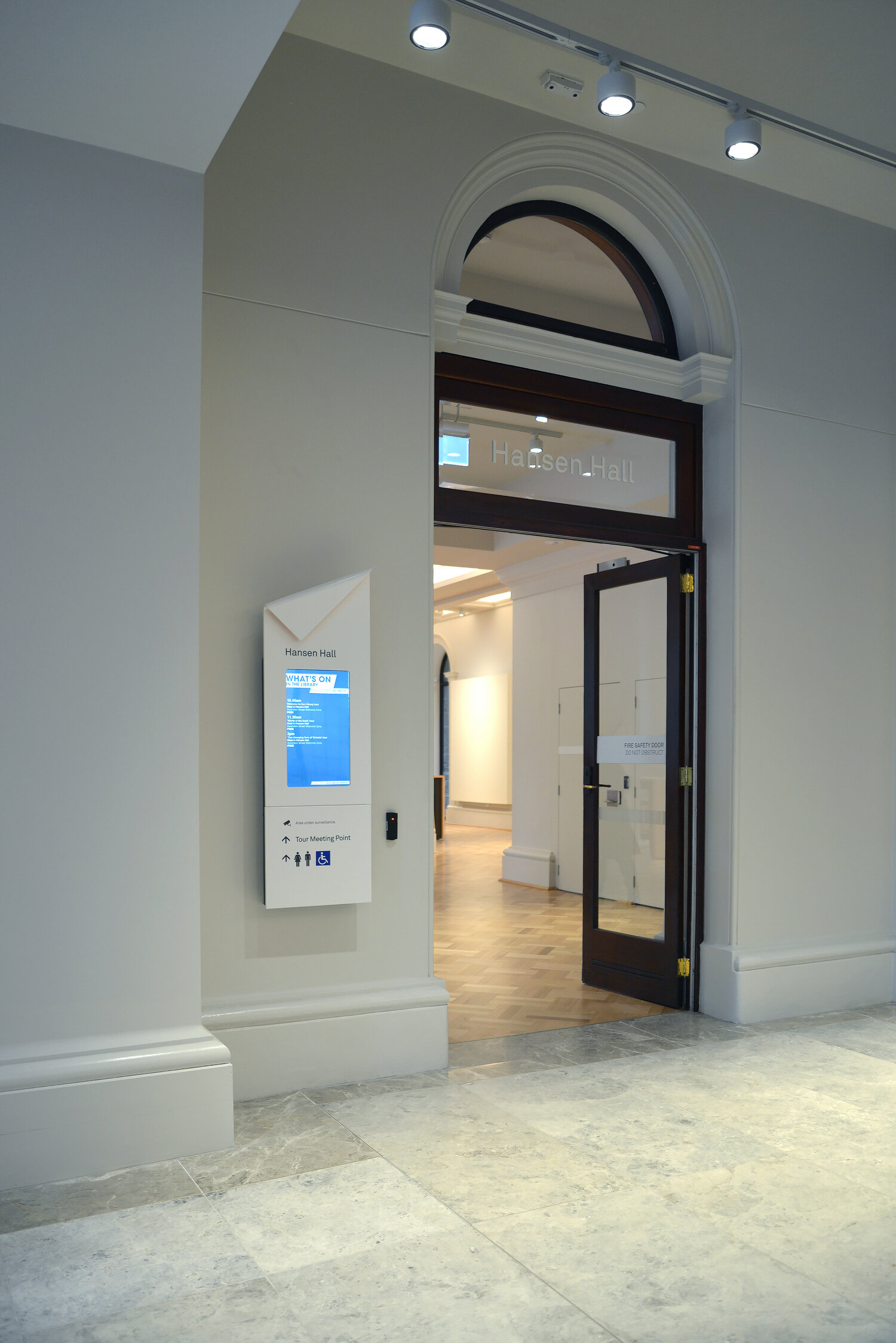基于维多利亚州立图书馆的建筑,Id实验室以简约的黑色无衬线字体搭配纯白色面板,整体视觉清爽。标牌采用折角设计,像是被翻页的书卷,与图书馆环境相得益彰。方向标识使用镂空的形式呈现,部分标牌使用电子信息屏,便于访客查阅信息。