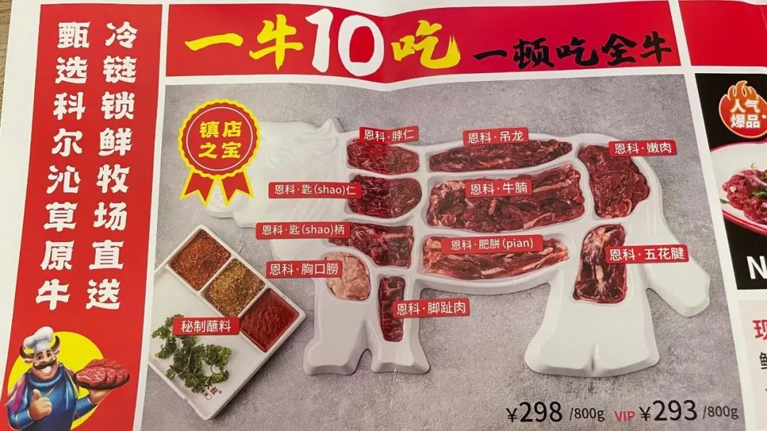 实际上一头牛拿来做烤肉的部位非常多。我们也找到了非常好的对标案例“一牛九吃”,自带购买理由,我们推出了“一牛10吃,一顿吃全牛”作为恩科大叔的特色菜品。同时,我们也据此制定了“全牛”(科尔沁草原牛)的产品战略,全牛进货全牛分解,除了烤肉之外也开发了鲜肉零售、卤牛肉、卤牛腩和牛杂杯等产品,不仅降低了供应链成本,还开发了更多的价值产品。