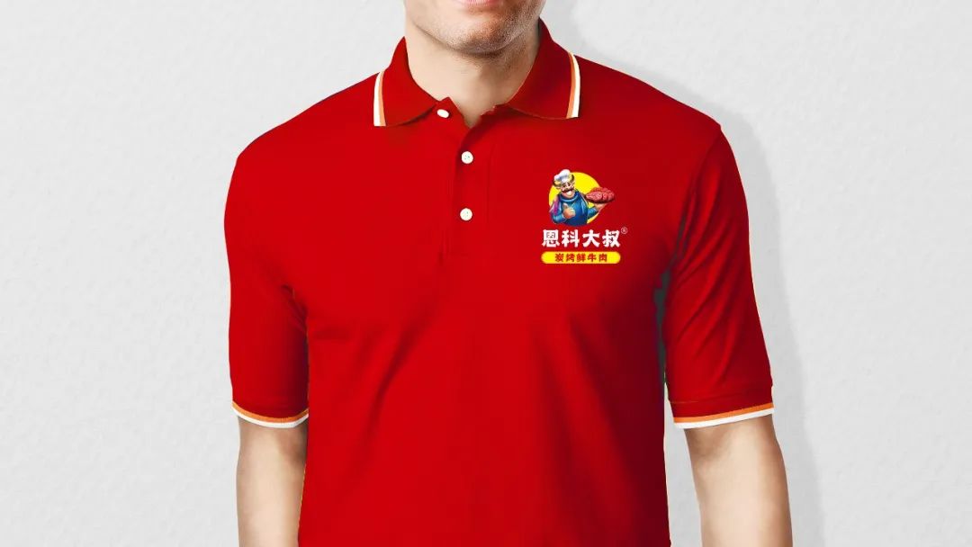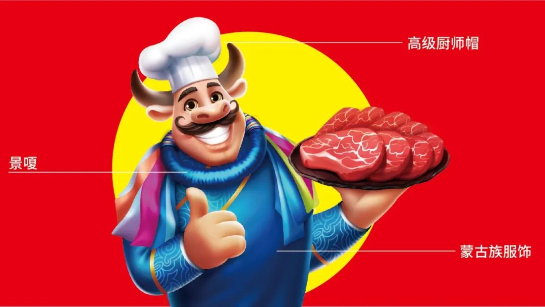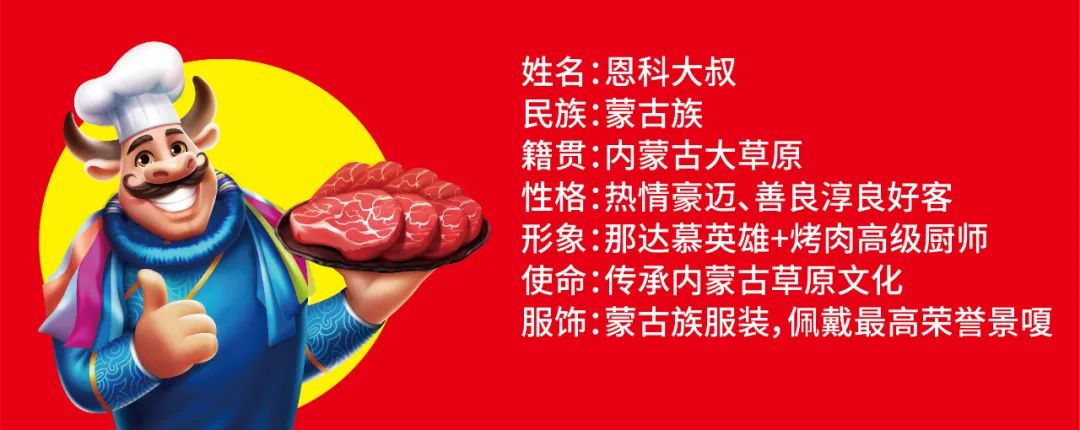 我们从高级厨师标志性符号、蒙古族文化、黑牛等文化元素中挖掘出了草原烤肉大师牛头人的超级符号:恩科大叔,恩科大叔作为草原烤肉大师的代表,穿上了蒙古族服饰,带上了最高荣誉的景嗄,作为中国餐饮界的最高代表。