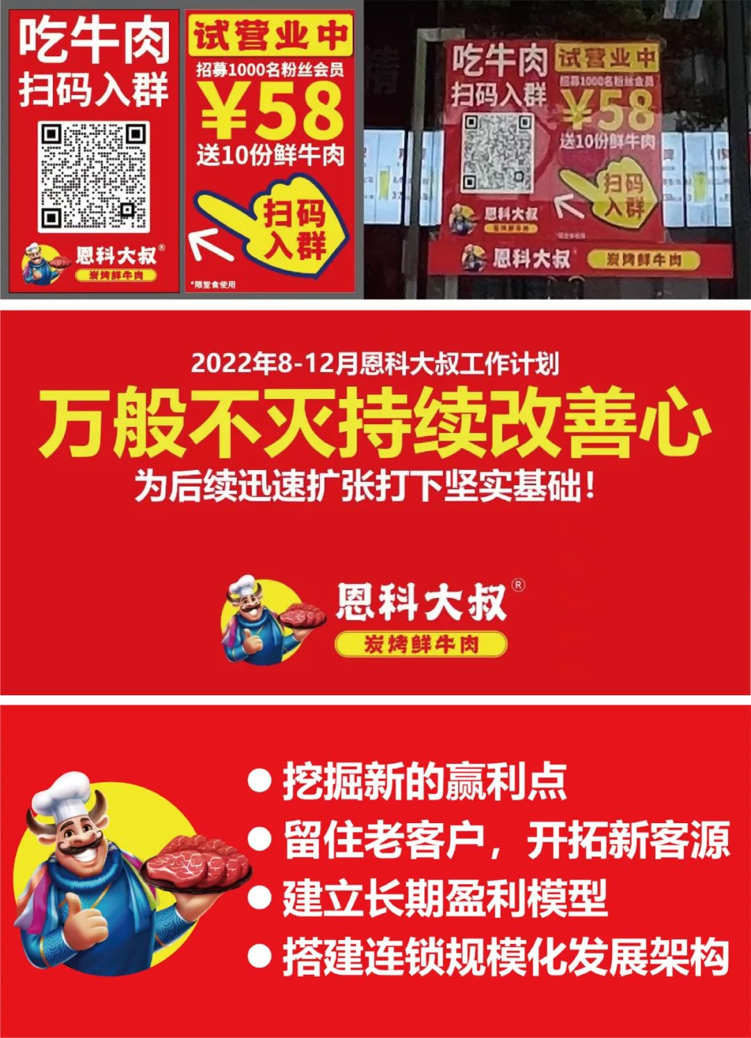 我们确定了将周五定为会员日,在每周的周五会员日推出相应的套餐和活动主题,同时在线下和线上做传播推广,后续我们还将推出“吃牛肉节”,家庭聚餐吃牛肉,打出了“孩子长身体,多吃鲜牛肉”、“吃足10个部位,吃足10种营养”的营销策划等等,为恩科大叔打来了更多的家庭粉丝群体。同时每个季度我们都将为恩科大叔制定详细的工作计划和关键动作,以持续提升恩科大叔的品牌价值。