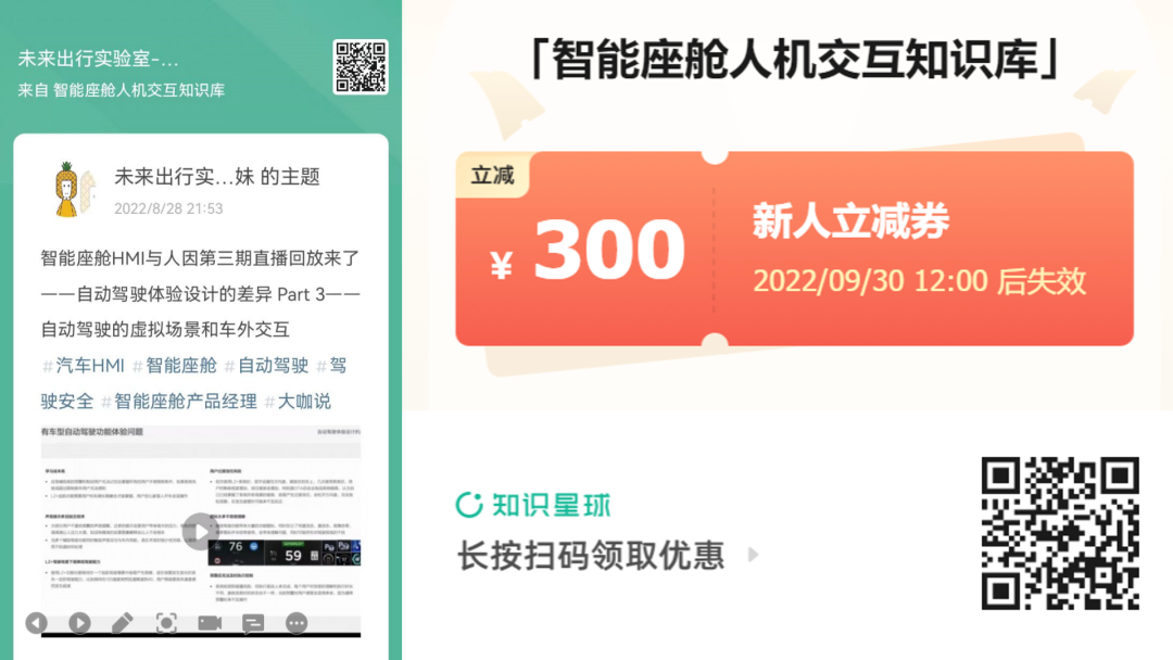 欢迎对智能座舱人机交互感兴趣的读者加入一起学习进步,为了答谢长期关注“未来出行实验室”的读者,我们也送出了几份新人券以表谢意。