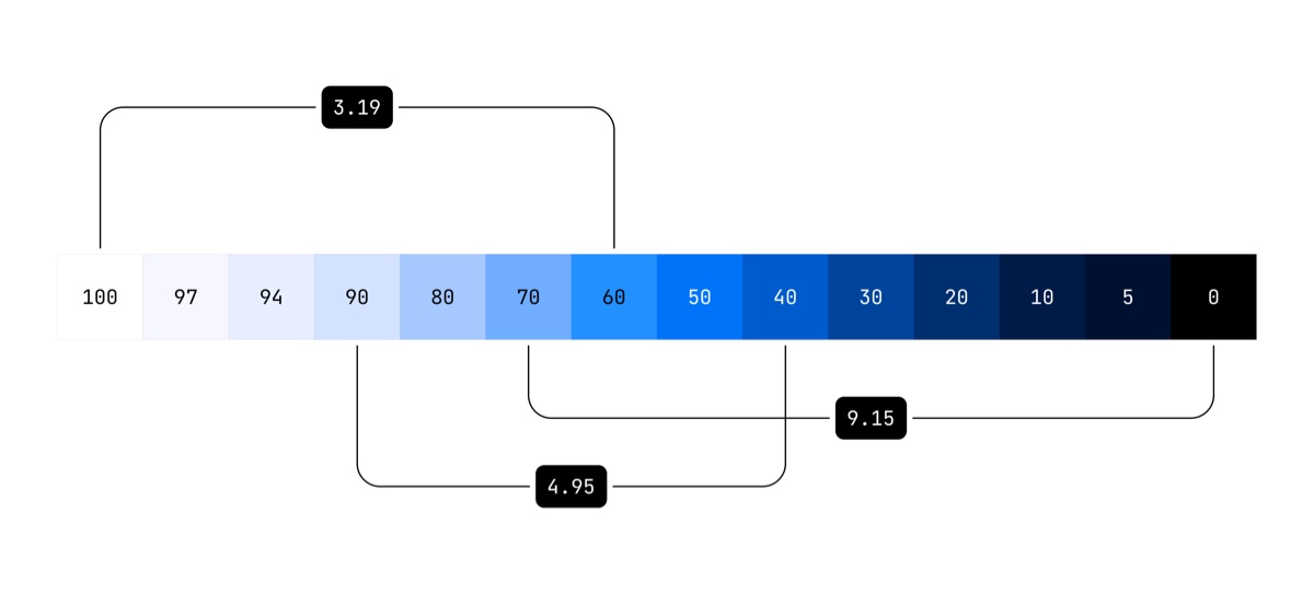 其次要理解色彩系统中色彩亮度的意味着什么?我们后续在设计配色方案时,需保证相关语义别名的颜色之间对比度符合 WCAG 标准,如内容与背景的颜色之间对比度需到 4.5 以上而,而对比度的本质是两个颜色之间感知亮度的差异。毫无夸张的说,色彩系统的本质是围绕亮度组合的设计,但是颜色的数值本身不提供任何与感知亮度相关的信息,我们也无法直接从两个颜色的数值上判断出他们的亮度差异(即对比度)。